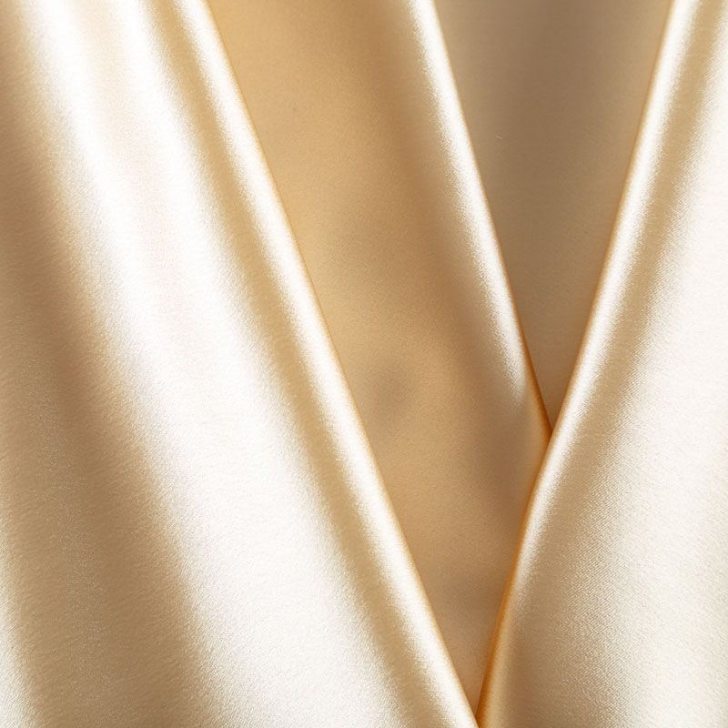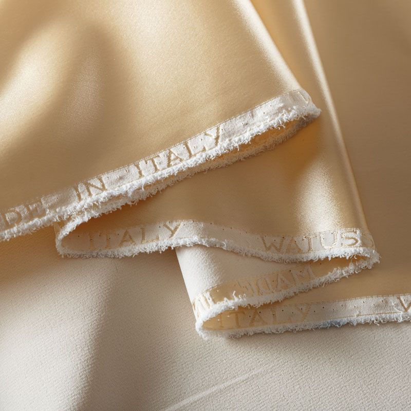 Итальянский костюмно-плательный атлас ватуссо сливочного оттенка. Ткань плотная, но пластичная, хорошо держит форму и отлично тянется, собирается в красивые складки и драпировки. Почти не мнется, очень удобный и практичный. Блеск умеренный, смотрится дорого, благородно. Подойдет для пошива прямых силуэтов-футляров, приталенных платьев с пышной юбкой и крупными драпировками, изделий с заложенными складками, нарядных изделий, вечерних костюмов, летнего пальто, юбки, для изготовления корсетов.