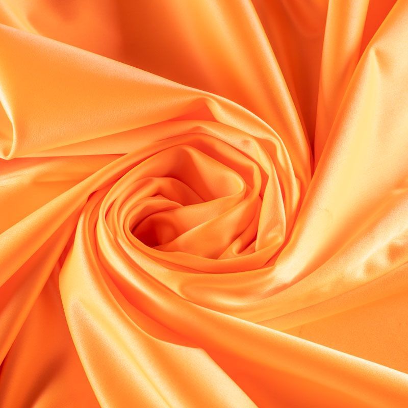 Итальянский костюмно-плательный атлас ватуссо яркого оранжевого цвета. Ткань плотная, но пластичная, хорошо держит форму и отлично тянется, собирается в красивые складки и драпировки. Почти не мнется, очень удобный и практичный. Блеск умеренный, смотрится дорого, благородно. Подойдет для пошива прямых силуэтов-футляров, приталенных платьев с пышной юбкой и крупными драпировками, изделий с заложенными складками, нарядных изделий, вечерних костюмов, летнего пальто, юбки, для изготовления корсетов.