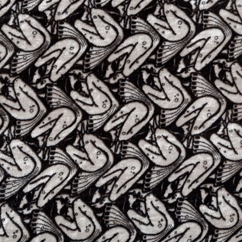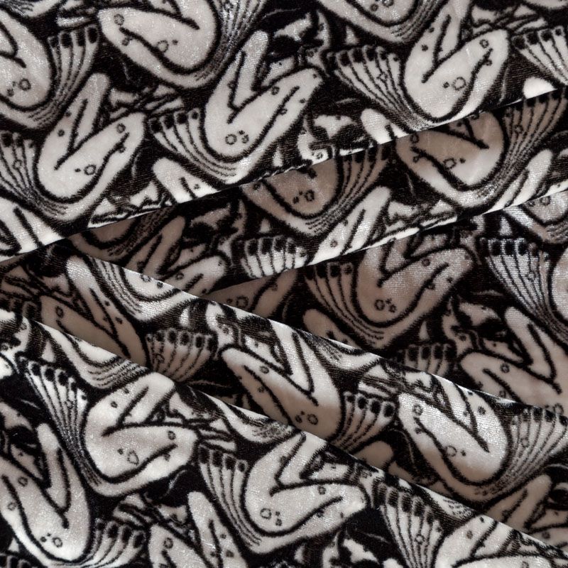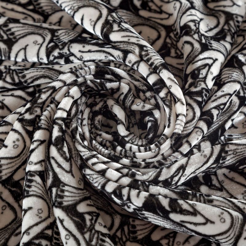 Итальянский бархат на шелковой основе с абстрактным черно-белым принтом. Ткань легкая, пластичная, мягкая, с коротким и блестящим ворсом, имеющим направление, очень приятная на ощупь, прекрасно драпируется. Подойдет для платья, юбки, туники, блузки, комбинезона, свободных брюк и костюма свободного кроя.