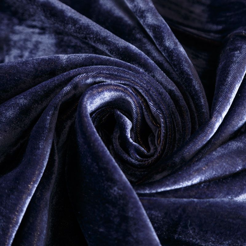 Итальянский шелковый бархат фиолетово-синего оттенка с золотистым едва заметным напылением. Ткань легкая, пластичная, мягкая, с коротким и блестящим ворсом, имеющим направление, очень приятная на ощупь, прекрасно драпируется. Подойдет для платья, юбки, туники, блузки, комбинезона, свободных брюк и костюма свободного кроя.