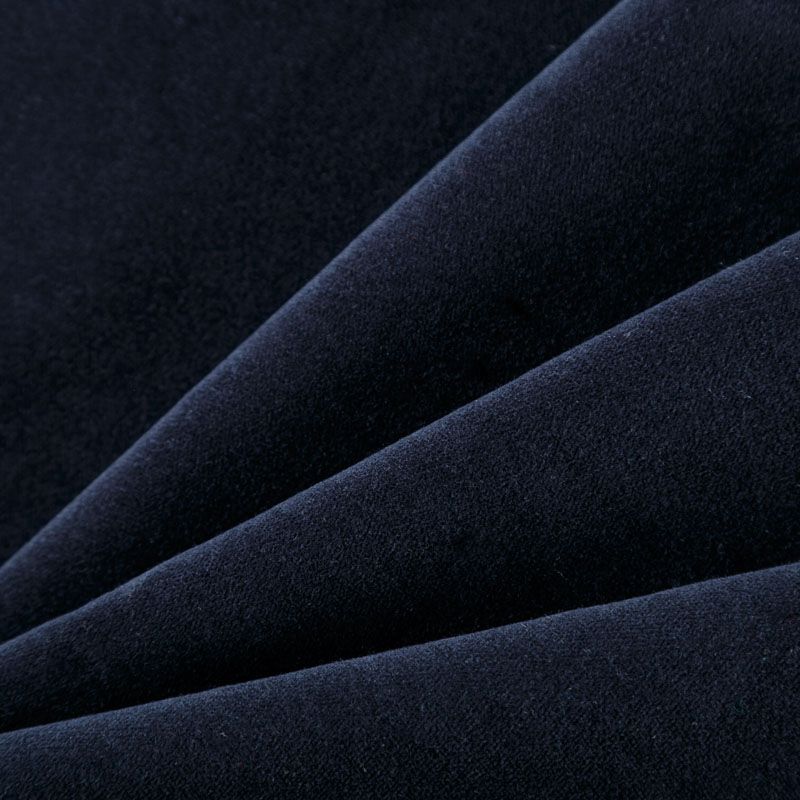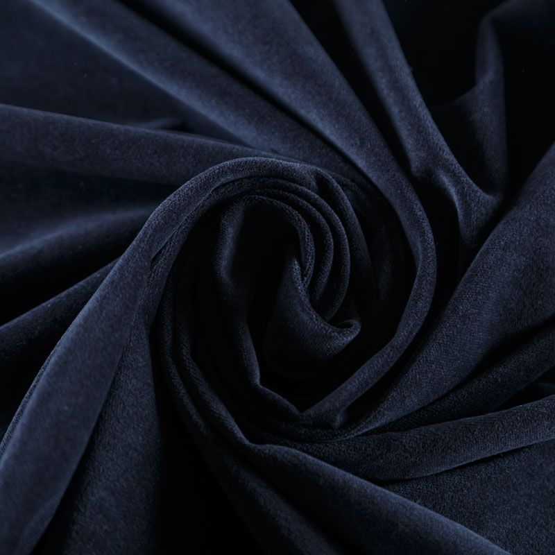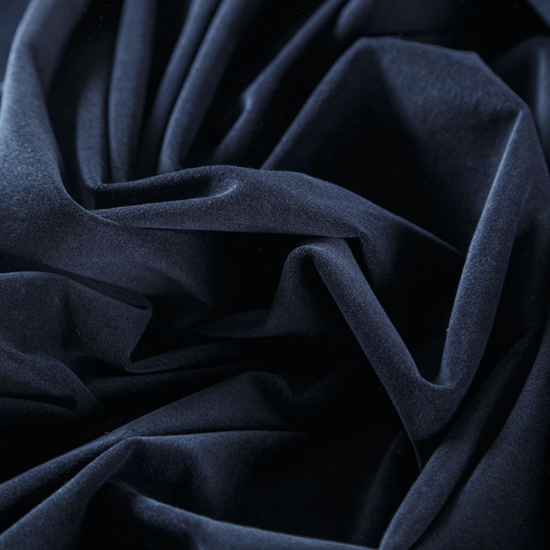 Хлопковый итальянский бархат в глубоком синем оттенке. Ткань плотная, мягкая с коротким ворсом. Не грубая, хорошо драпируется, пластичная, тянется за счет эластана в составе. Имеет благородный матовый оттенок. Подойдет для пошива нарядного костюма, жакета, юбки, жилета, шорт, комбинезонов, брюк, платья-футляр, легкого пальто или бомбера.