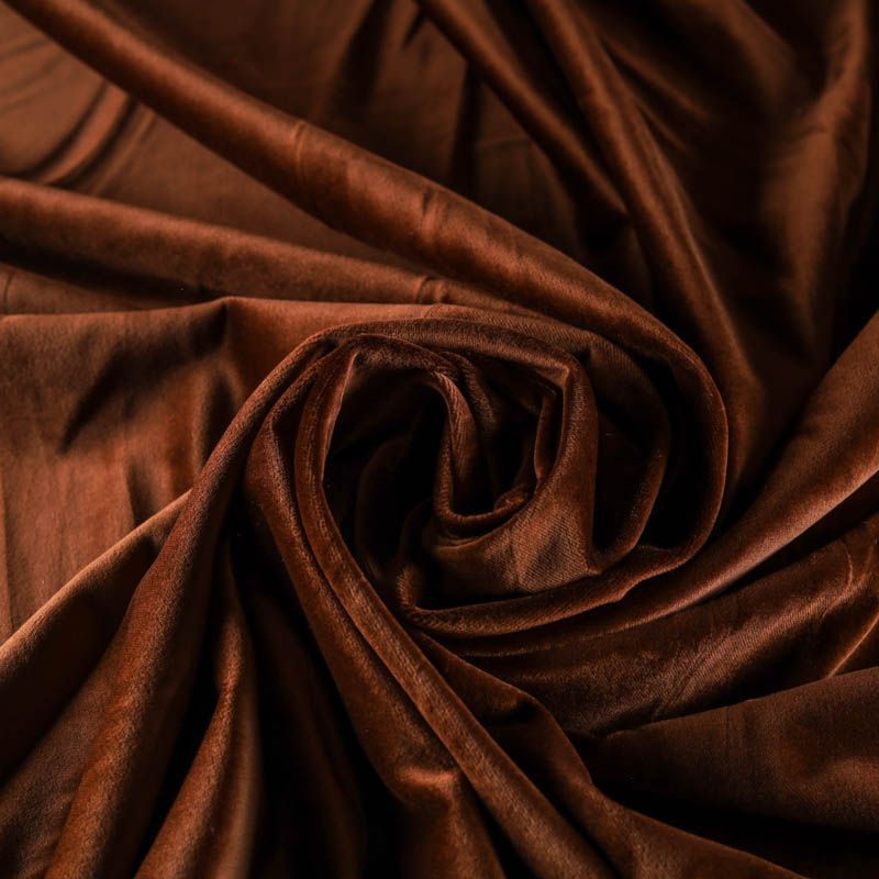 Хлопковый итальянский бархат насыщенного коричневого цвета. Ткань плотная, мягкая с коротким ворсом. Не грубая, хорошо драпируется. Имеет благородный матовый оттенок. Подойдет для пошива нарядного костюма, жакета, юбки, жилета, шорт, комбинезонов, брюк, платья-футляр, легкого пальто или бомбера.