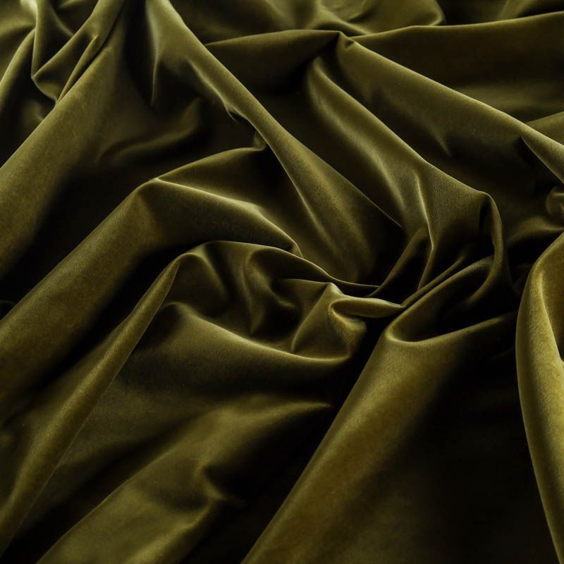 Хлопковый итальянский бархат цвета хаки зеленоватого оттенка. Ткань плотная, мягкая с коротким ворсом. Не грубая, хорошо драпируется. Имеет благородный матовый оттенок. Подойдет для пошива нарядного костюма, жакета, юбки, жилета, шорт, комбинезонов, брюк, платья-футляр, легкого пальто или бомбера.