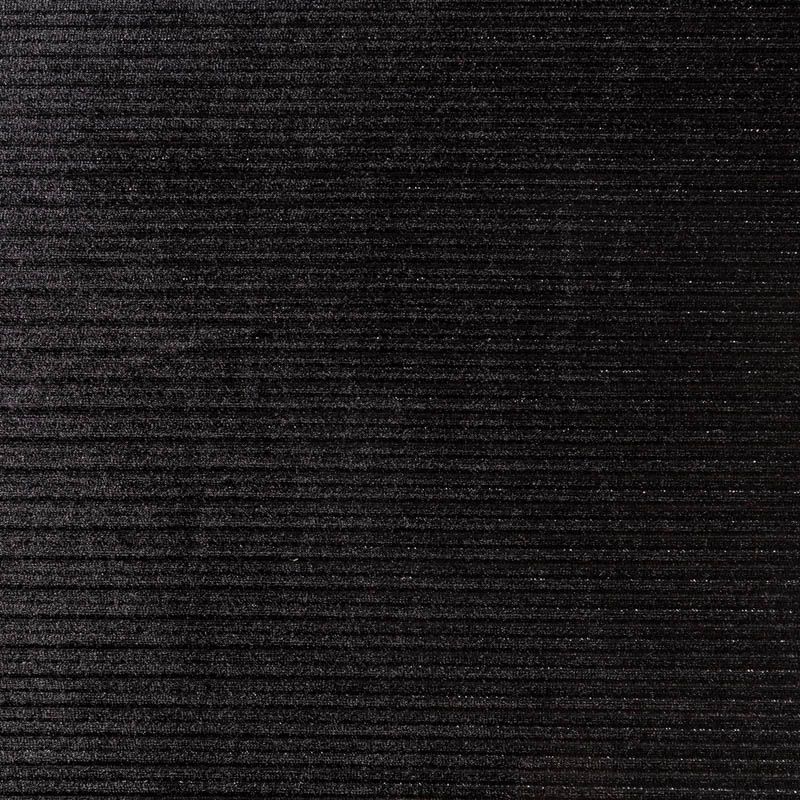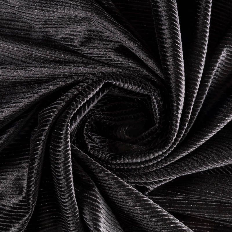 Бархат с выработкой в рубчик, как на вельвете глубокого черного цвета с люрексовой нитью. Ткань очень приятна на ощупь, не мнется, мягкая, нежная, хорошо тянется и драпируется. Цвет играет отблесками и полутонами. Бархат идеально подходит для пошива вечерних платьев, юбок, костюмов, а также стильных аксессуаров.