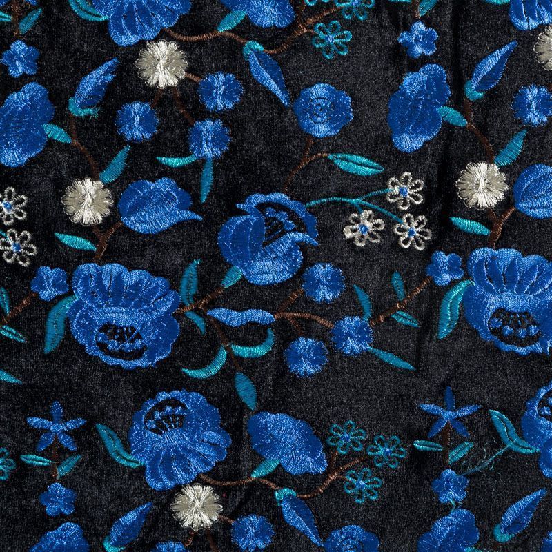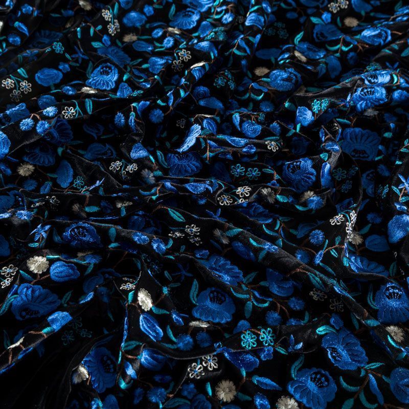 Итальянский бархат черного цвета, декорирован вышивкой фантазийными цветами в голубых оттенках, расположенной по всему полотну. Ткань приятная на ощупь, хорошо драпируется и держит форму, обладает благородным блеском, тянется за счет эластана в составе. Прекрасно подойдет для жакета, юбки, костюма, жилета, платья.