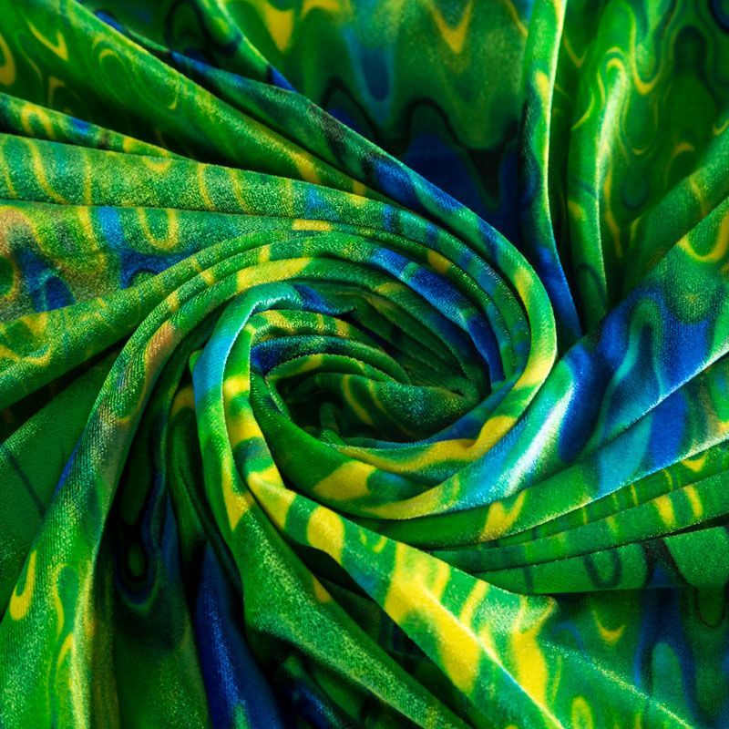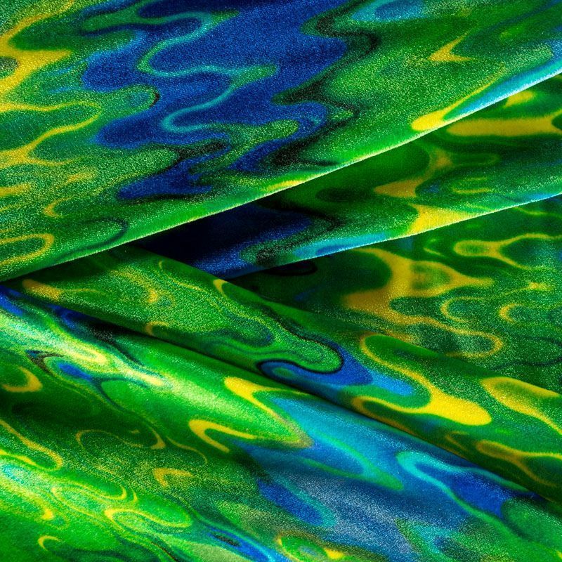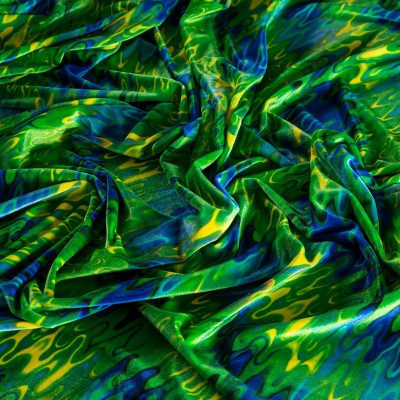 Пластичный, мягкий бархат с абстрактным дизайном в зелено-синих оттенках. Ткань очень приятна на ощупь, не мнется, хорошо тянется за счет эластана в составе и драпируется. Цвет играет отблесками и полутонами. Бархат идеально подходит для пошива вечерних платьев, юбок, костюмов, а также стильных аксессуаров.