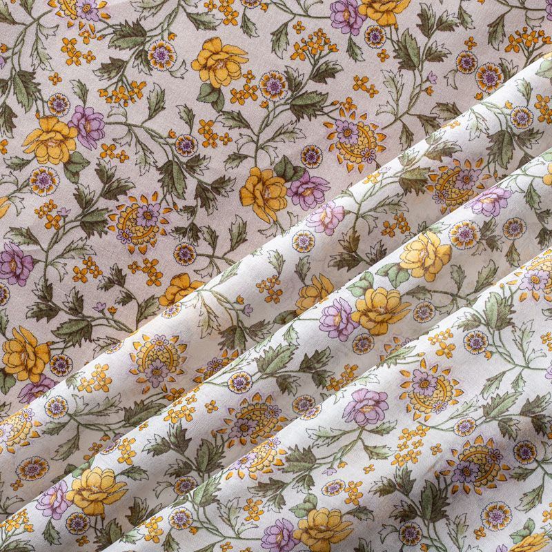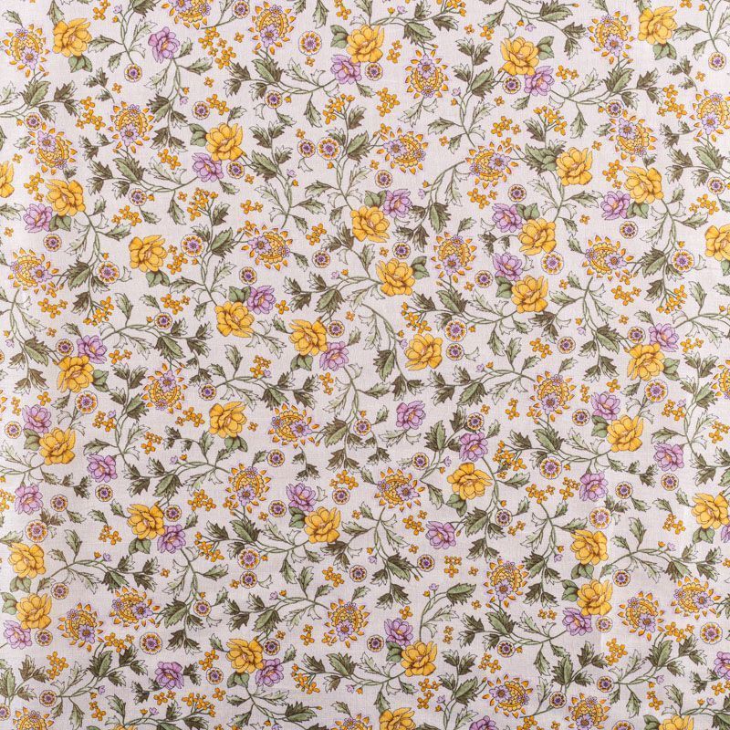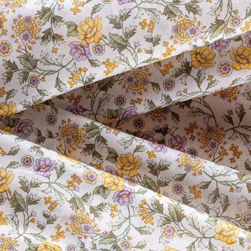 Итальянский хлопковый батист с мелким растительным принтом в желто-лавандовых оттенках на молочном фоне. Ткань очень легкая, прозрачная, приятная на ощупь, нежная, пластичная, хорошо и мягко драпируется, летящая. Батист подойдёт для модных блуз с объёмными рукавами, летних платьев и сарафанов с длинной летящей юбкой, прозрачных рубашек, декорированных объёмными бантами, туник и топов.