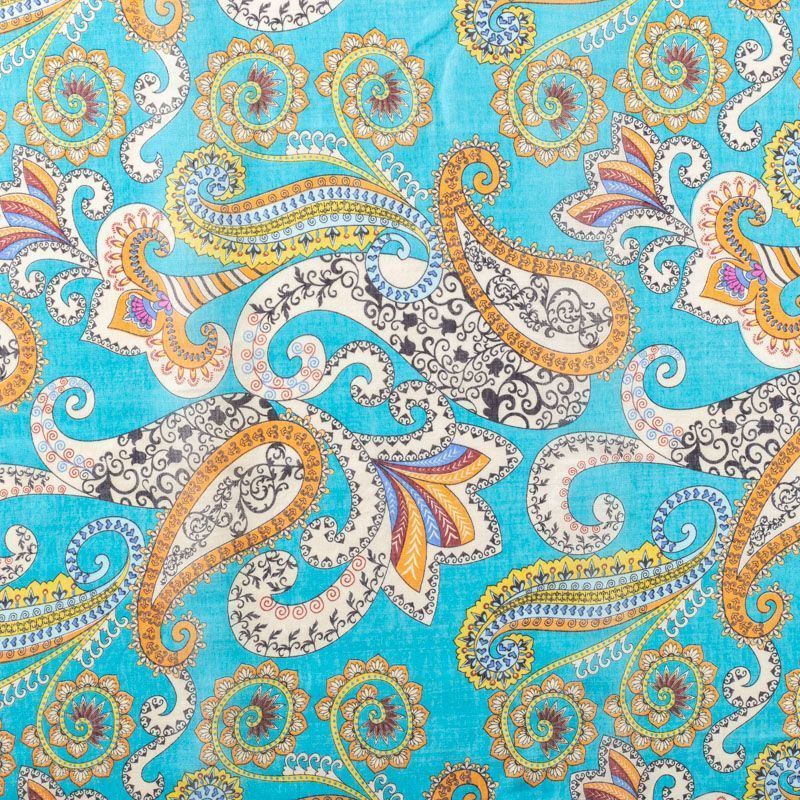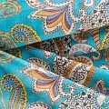 Батист с цветным принтом пейсли в молочно-коричневых оттенках на бирюзовом фоне. Ткань очень легкая, прозрачная, приятная на ощупь, нежная, пластичная, хорошо и мягко драпируется, летящая. Батист подойдёт для модных блуз с объёмными рукавами, летних платьев и сарафанов с длинной летящей юбкой, прозрачных рубашек, декорированных объёмными бантами, туник и топов.