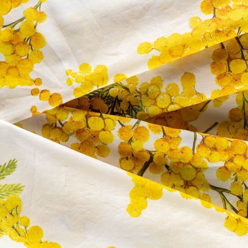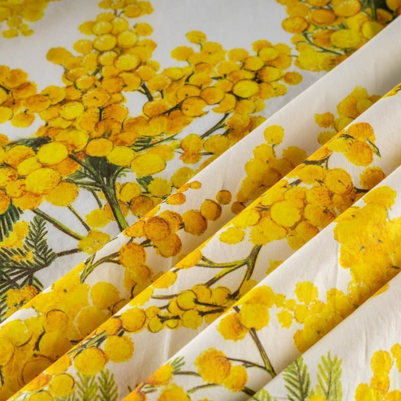 Ткань прозрачная, приятная на ощупь, нежная, хорошо и мягко драпируется, летящая. Хлопковый батист подойдёт для модных блуз с объёмными рукавами, летних платьев и сарафанов с длинной летящей юбкой, прозрачных рубашек, декорированных объёмными бантами. Яркий весенний принт в виде веток цветущей мимозы в солнечно желтых и зеленых оттенках на молочном фоне.