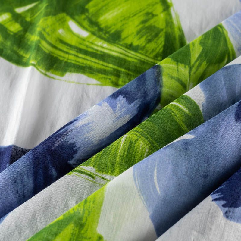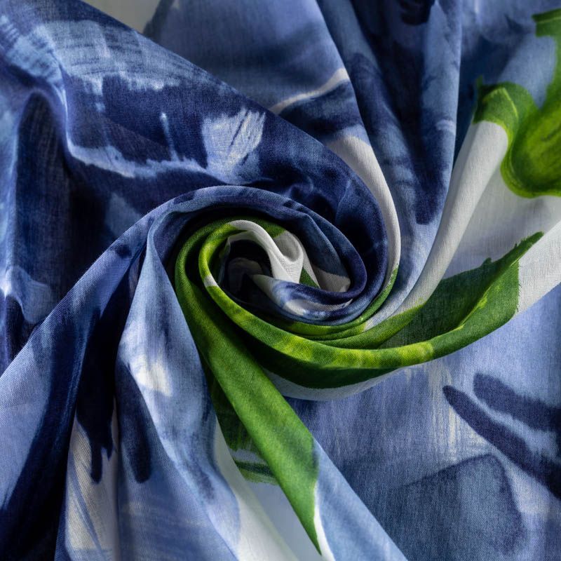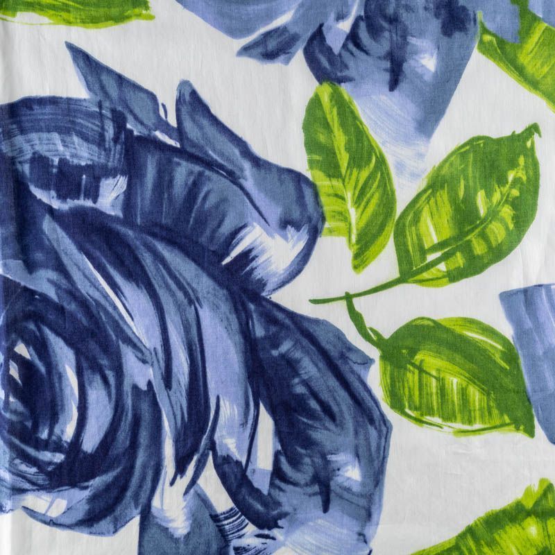 Ткань прозрачная, приятная на ощупь, нежная, хорошо и мягко драпируется, летящая. Хлопковый батист подойдёт для модных блуз с объёмными рукавами, летних платьев и сарафанов с длинной летящей юбкой, прозрачных рубашек, декорированных объёмными бантами. Крупный принт в виде цветов и листьев в голубых и зеленых оттенках на молочном фоне.