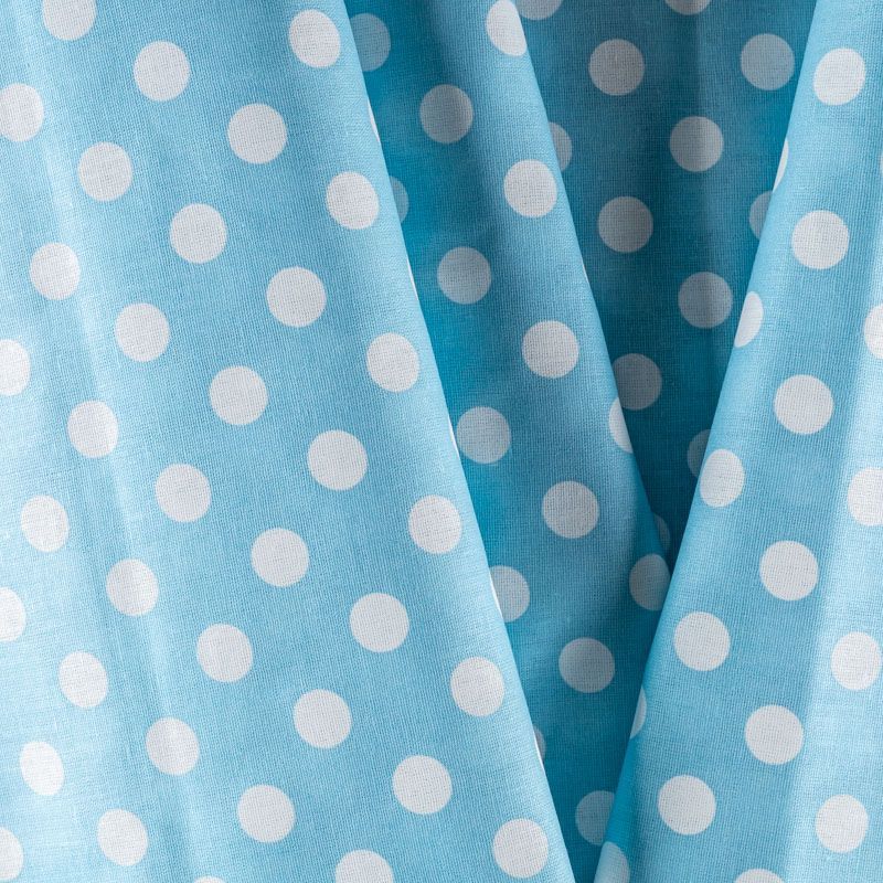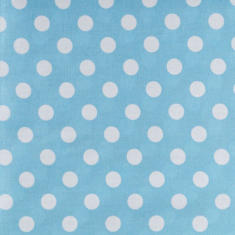 Плотная натуральная ткань с особым принципом переплетения нитей: крест-накрест. Имеет гладкую матовую поверхность чуть шероховатую на ощупь, не тянется, немного просвечивает. Прочная и стойкая к износу, надолго сохраняет яркость красок, не растягивается при стирке, практически не мнется. Принт в белый горошек среднего размера (1,5 см) на голубом фоне прекрасно подойдет для пошива постельного белья, изготовления пеленок, бортиков для кроватки, домашней одежды и других предметов интерьера.