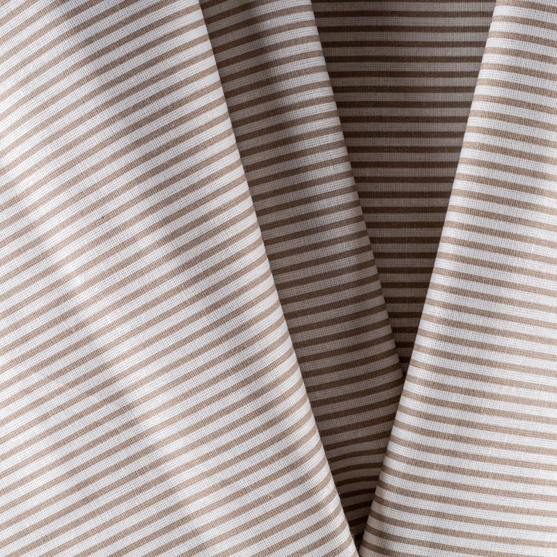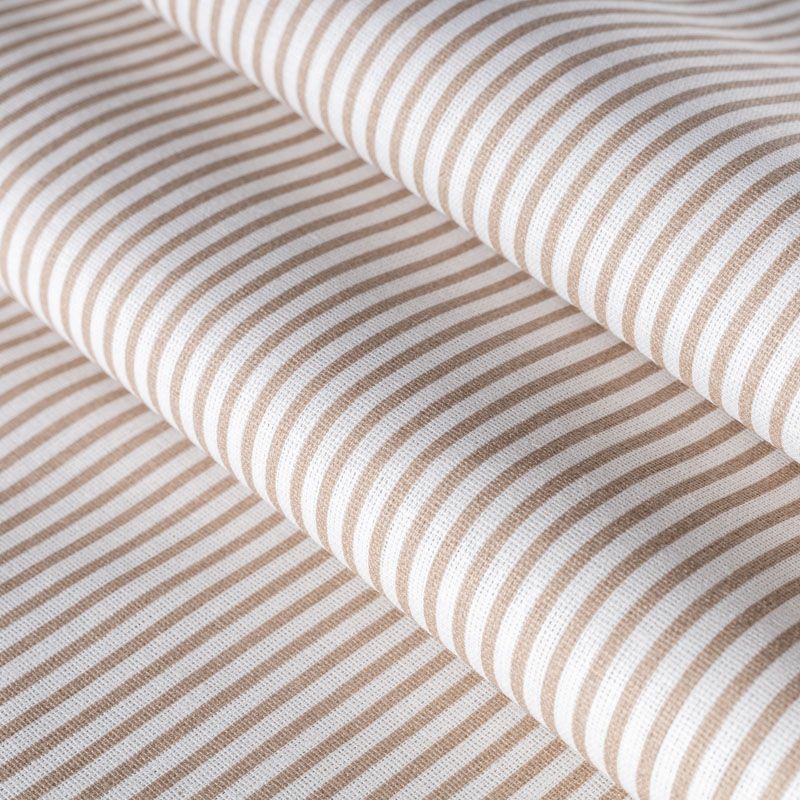 Плотная натуральная ткань с особым принципом переплетения нитей: крест-накрест. Имеет гладкую матовую поверхность чуть шероховатую на ощупь, не тянется, немного просвечивает. Прочная и стойкая к износу, надолго сохраняет яркость красок, не растягивается при стирке, практически не мнется. Рисунок в узкую бежевую полоску на белом фоне прекрасно подойдет для пошива постельного белья, изготовления пеленок, бортиков для кроватки, домашней одежды и других предметов интерьера.