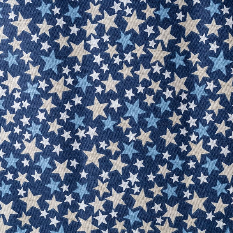 Плотная натуральная ткань с особым принципом переплетения нитей: крест-накрест. Имеет гладкую матовую поверхность чуть шероховатую на ощупь, не тянется, немного просвечивает. Прочная и стойкая к износу, надолго сохраняет яркость красок, не растягивается при стирке, практически не мнется. Принт в виде цветных звездочек разного размера на темно-синем фоне прекрасно подойдет для пошива постельного белья, изготовления пеленок, бортиков для кроватки, домашней одежды и других предметов интерьера.