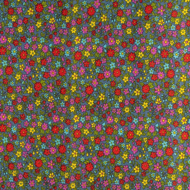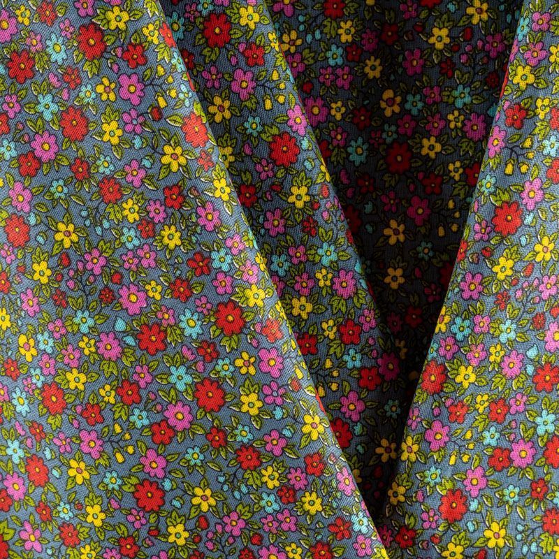 Плотная натуральная ткань с особым принципом переплетения нитей: крест-накрест. Имеет гладкую матовую поверхность, немного шероховатая на ощупь, не тянется, немного просвечивает. Прочная и стойкая к износу, надолго сохраняет яркость красок, практически не мнется. Мелкий цветочный принт на сером фоне прекрасно подойдет для пошива домашней одежды, халатов, фартуков, сарафанов и других предметов интерьера.
