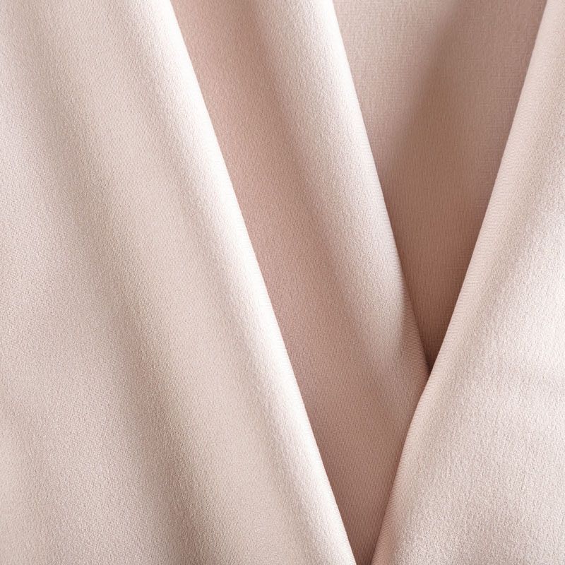 Трикотажное полотно средней плотности. Обе стороны ткани ровные, гладкие. Материал эластичный, упругий, имеет растяжимость по всем сторонам, хорошо держит форму, уютный, приятный к телу и удобный в носке. Подойдет для пошива платьев, юбок, костюмов, жакетов, брюк.