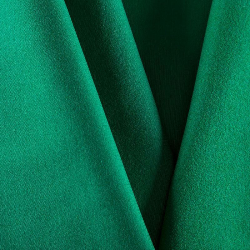 Эластичный, плотный хлопковый трикотаж изумрудного оттенка с теплым подтоном. Поверхность ткани гладкая и матовая, с изнанки - с шелковистым мягким ворсом.  Материал упругий, имеет растяжимость по всем сторонам, не просвечивается, хорошо держит форму, уютный, приятный к телу и удобный в носке. Применяется в пошиве костюмов, жакетов, кардиганов, платьев и юбок.