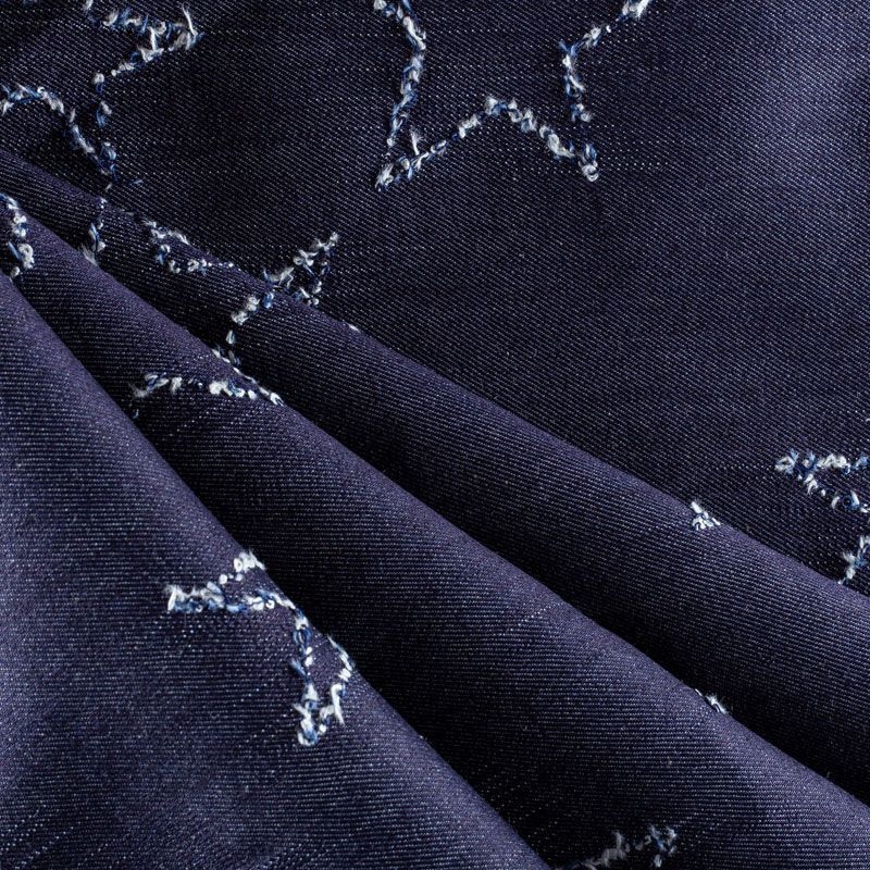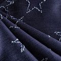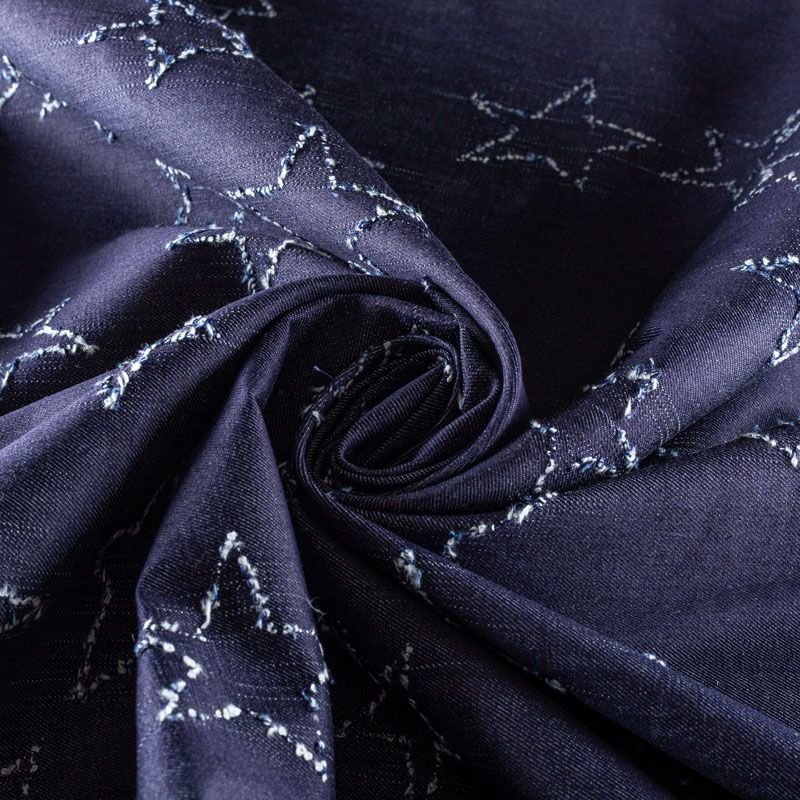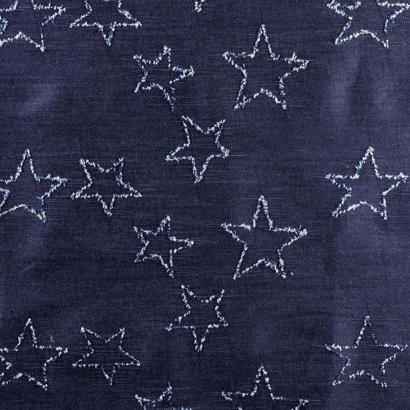 Плотная джинсовая ткань темно-синего оттенка с жаккардовым узором в виде звезд. Ткань имеет диагональное плетение, не большую толщину, мягкая и приятная на ощупь, тянется за счет