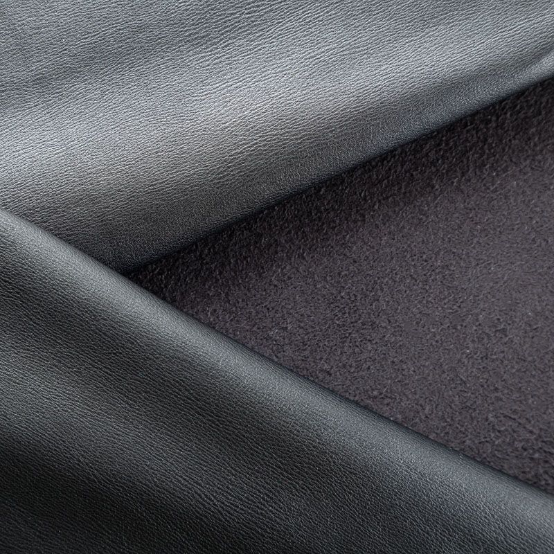 Искусственный материал, имитирующий натуральную кожу черного цвета. Поверхность матовая, гладкая. Изнаночная сторона с имитацией черной замши. Приятная на ощупь, тянется, не просвечивает, пластичная. Подойдет для пошива куртки, костюма, платья, юбки, брюк, шорт, комбинезона, сумки, рюкзака.