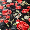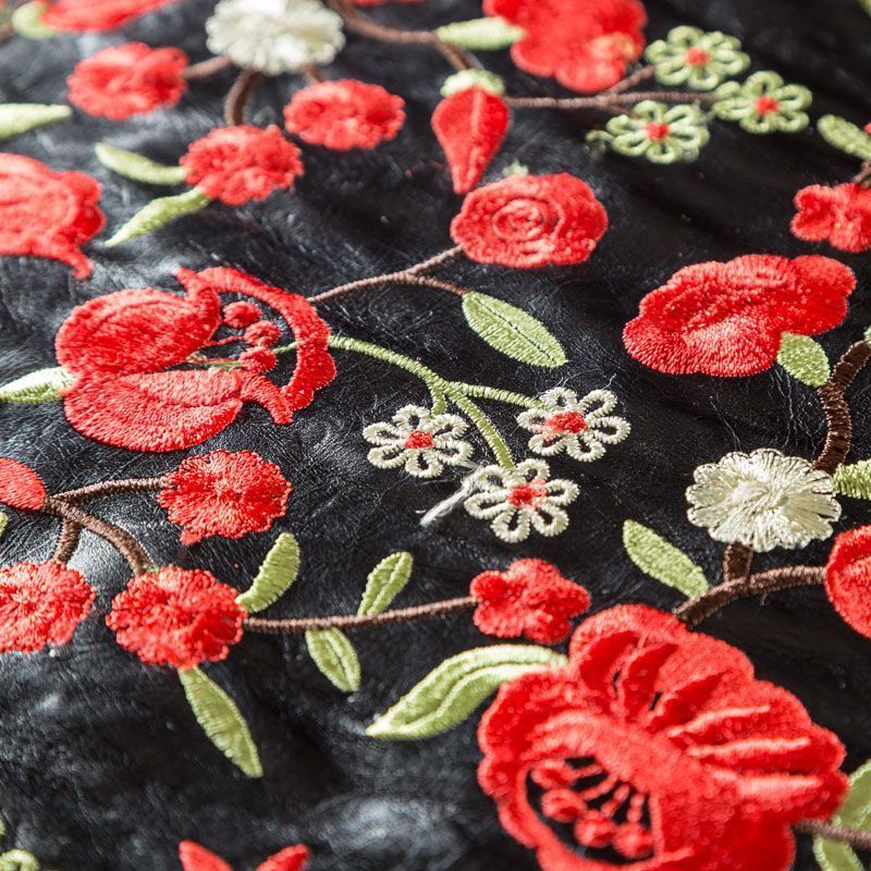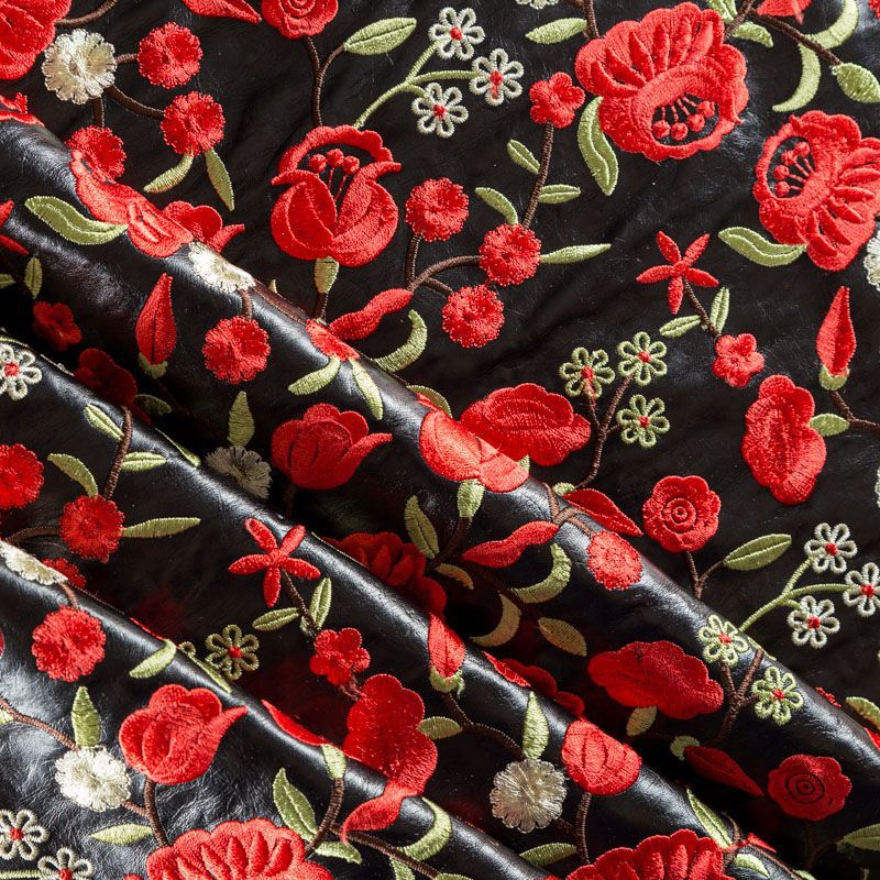 Искусственный материал, имитирующий натуральную кожу черного цвета с богатой объемной цветочной вышивкой в красных оттенках. Поверхность ткани полуматовая, гладкая. Приятная на ощупь, держит форму, не просвечивает, пластичная. Подойдет для пошива куртки, костюма, платья, юбки, брюк, шорт, комбинезона, сумки, рюкзака.