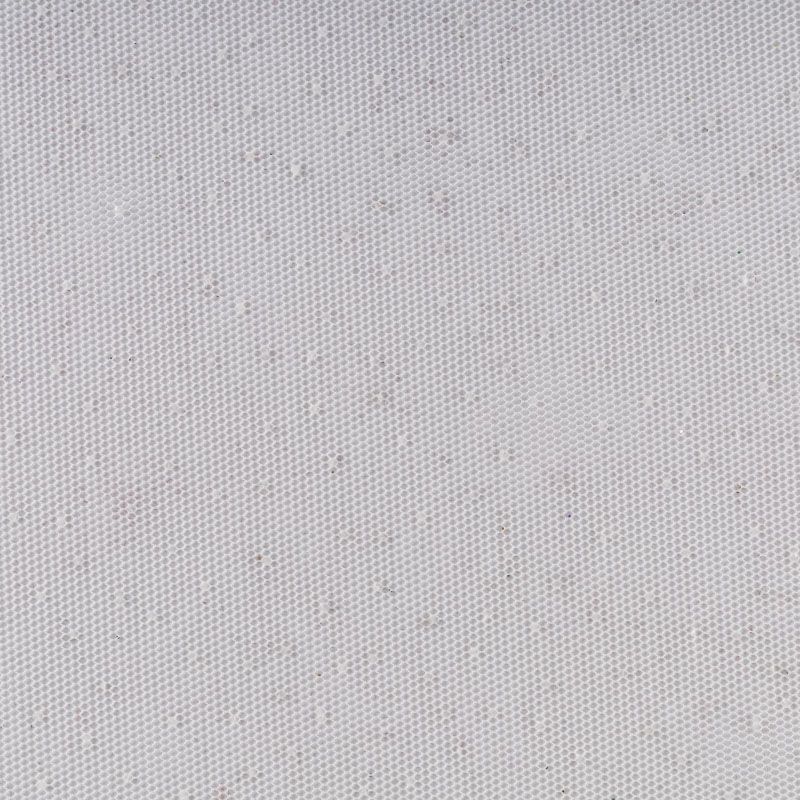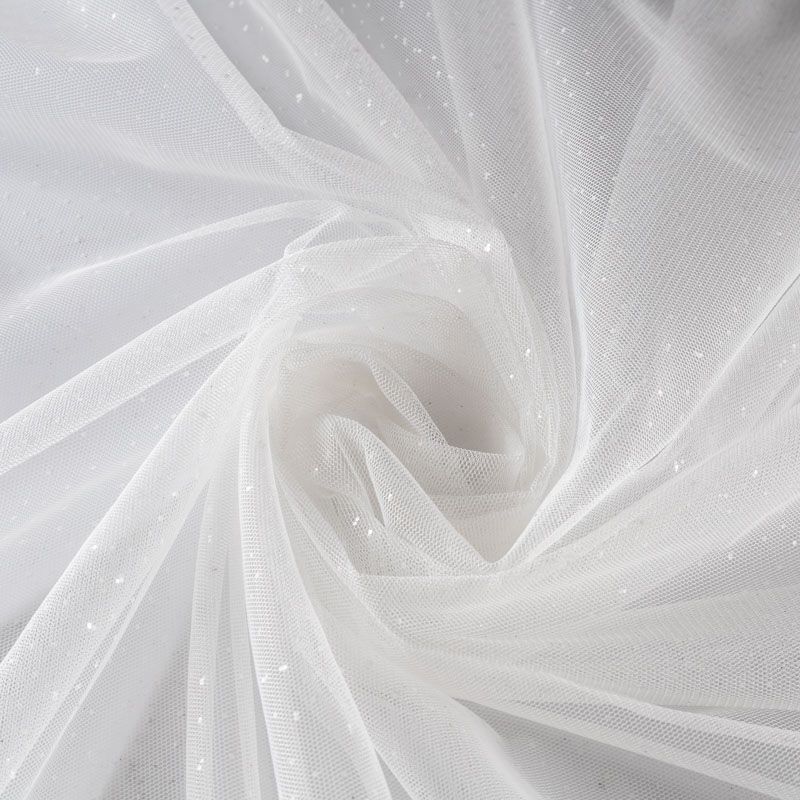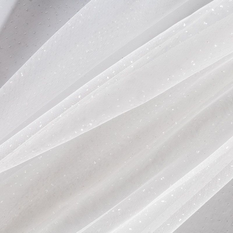 Полотно мягкое и матовое с искрящимися блестками. Неплохо драпируется в  слегка держащие форму складки, имеет мелкое сетчатое плетение, прияный на ощупь. Подойдет для пошива платья, юбки-пачки, фаты и других коктейльных и вечерних нарядов или аксессуаров.
