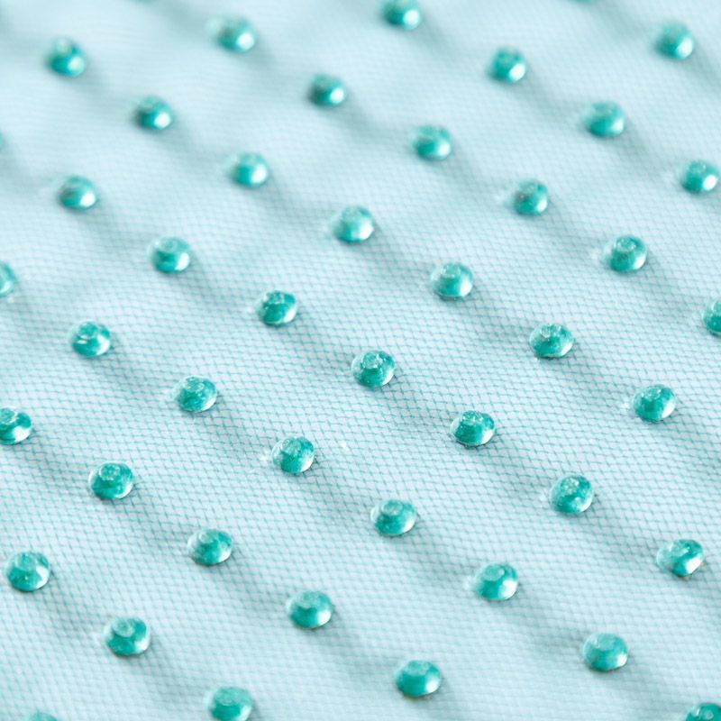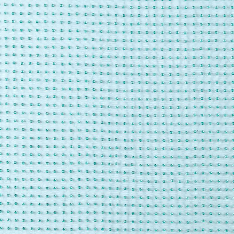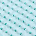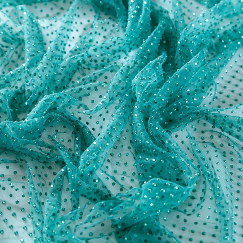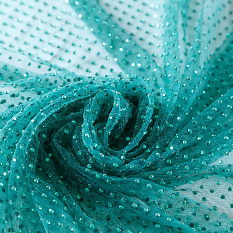 Тонкая прозрачная сетка средней жесткости зеленого оттенка декорирована клеевыми стразами в тон полотна. Используется для пошива одежды для различных праздников, концертов, пышных юбок, платьев, а также для отделки и украшения, создания предметов декора и украшения помещений для торжественных мероприятий.