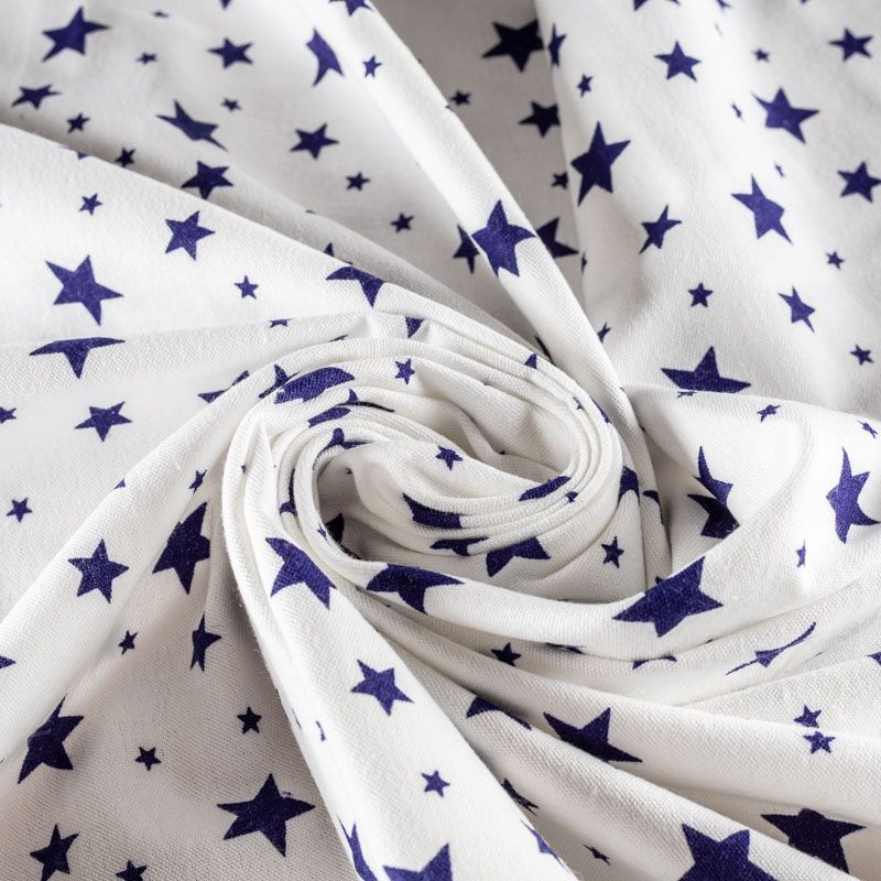 Износостойкий мягкий материал, не раздражает кожу, не садится, отлично впитывает влагу и хорошо удерживает тепло. На внутренней стороне короткий мягкий ворс. Милый принт в виде синих звездочек разного размера на белом фоне прекрасно подойдет для пошива постельного белья, изготовления пеленок, бортиков для кроватки, домашней одежды, пижамы и других предметов интерьера.