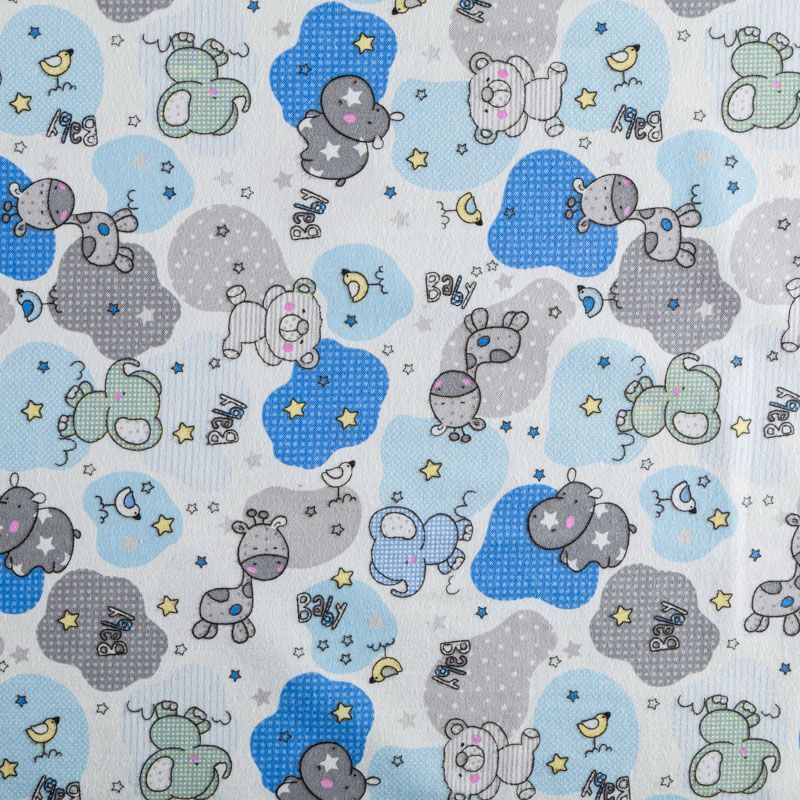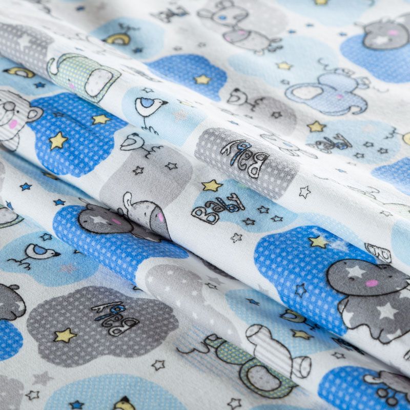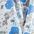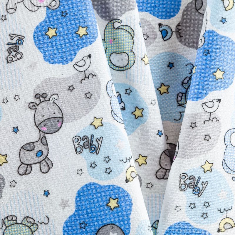 Износостойкий мягкий материал, не раздражает кожу, не садится, отлично впитывает влагу и хорошо удерживает тепло. На лицевой стороне мягкий ворс. Милый детский принт в виде рисованных тропических животных на белом фоне прекрасно подойдет для пошива постельного белья, изготовления пеленок, бортиков для кроватки, домашней одежды, пижамы и других предметов интерьера.