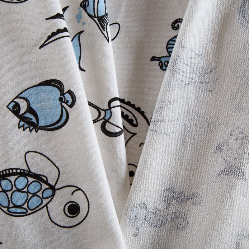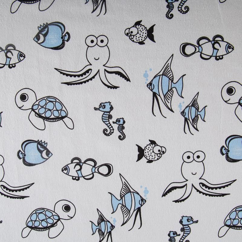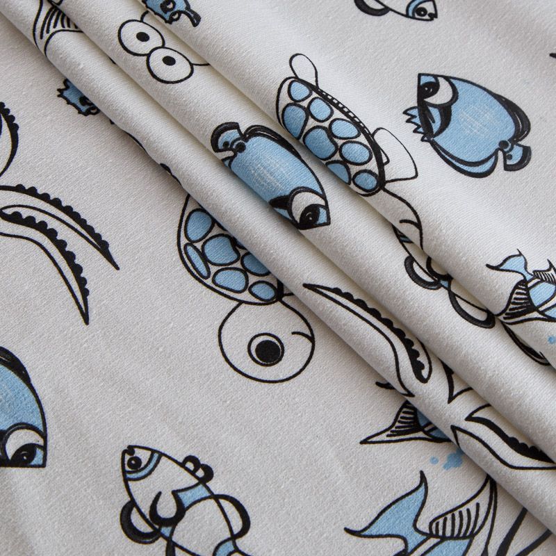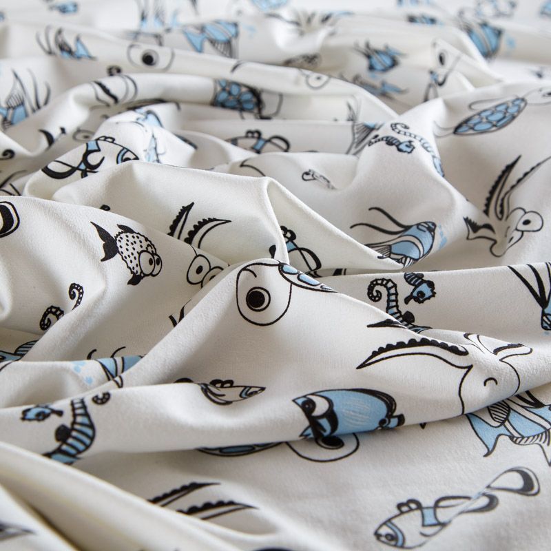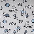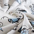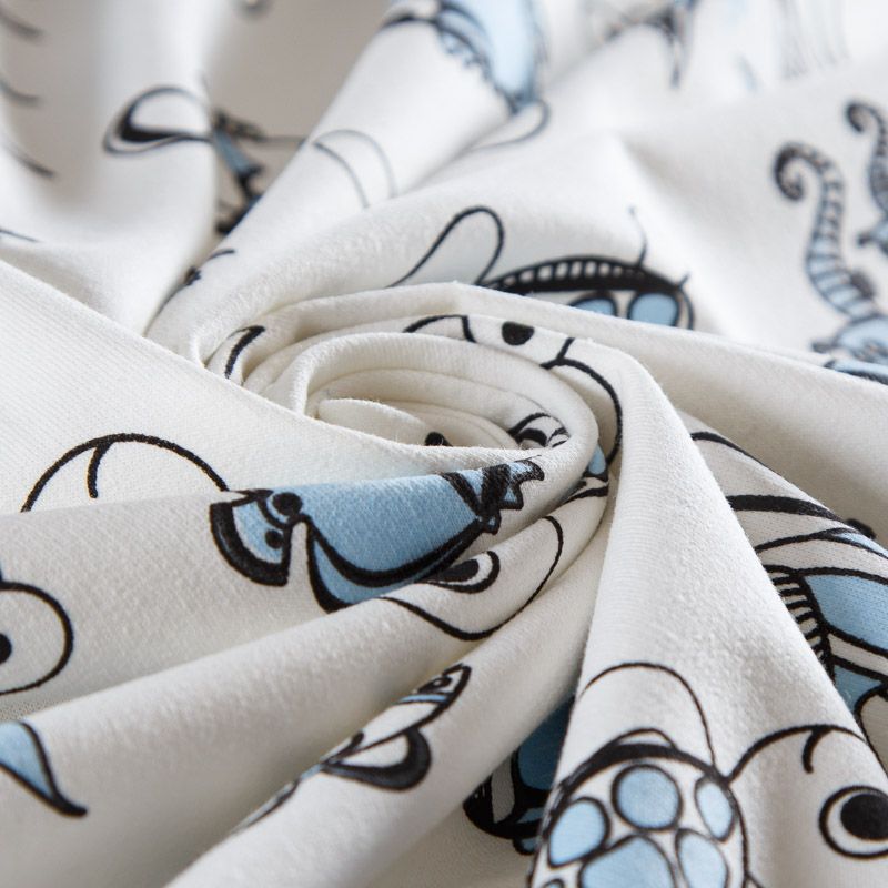 Итальянский хлопковый мягкий эластичный трикотаж средней плотности. Лицевая сторона гладкая, без блеска, мелкой вязки с детским принтом. Изнанка – с небольшим однородным ворсом или петля. Прекрасный вариант для пошива платьев и костюмов, легких толстовок, свитшотов, спортивной, детской и  домашней одежды.