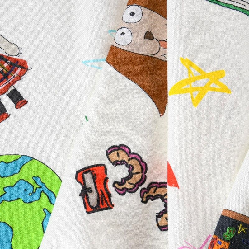 Итальянский футер с ярким игривым принтом на белом фоне от известного бренда. Материал гладкий с лицевой стороны, с изнаночной стороны имеет нежную мелкую петельчатую текстуру. Ткань мягкая и комфортная, достаточно эластичная, пластичная. Хорошо садится по фигуре. Практически не мнется. После растяжения быстро возвращается к прежней форме. Подойдет для пошива толстовки, спортивного костюма, джоггеров, шорт, свитшота, кроп-топа, платья в спортивном стиле.