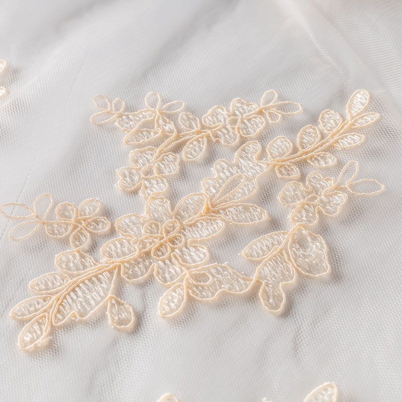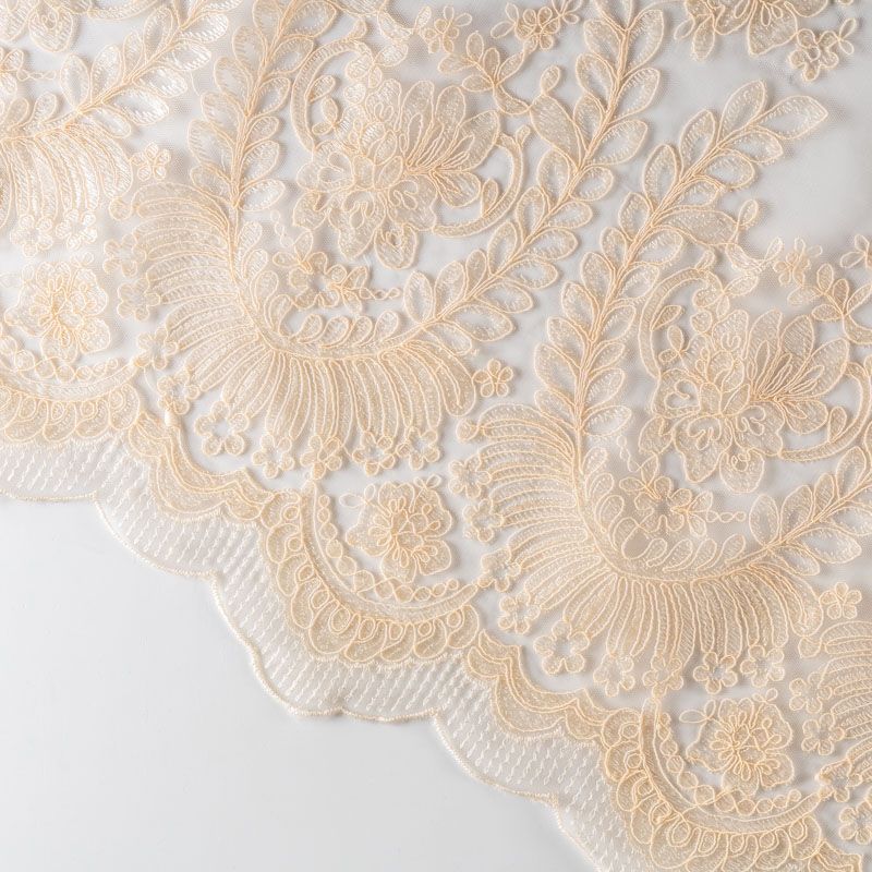 Вышивка на сетке в оттенке спелой мякоти банана с крупным флористическим узором. Полотно мягкое, легкое и пластичное, хорошо тянется. Сетка не жесткая, приятная к телу. Узор вышит мягкой пряжей, образуя красивую фактуру, имитирующую ручную вышивку, и оформлен кордовой нитью. С обеих сторон ткань украшена симметричными фестонами, что придает полотну законченный и нарядный вид. Великолепно будет смотреться в нарядном вечернем, свадебном платье, платье на выпускной бал, в юбках, блузках, топах. Набирается для изделя объемом.