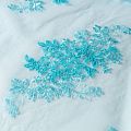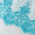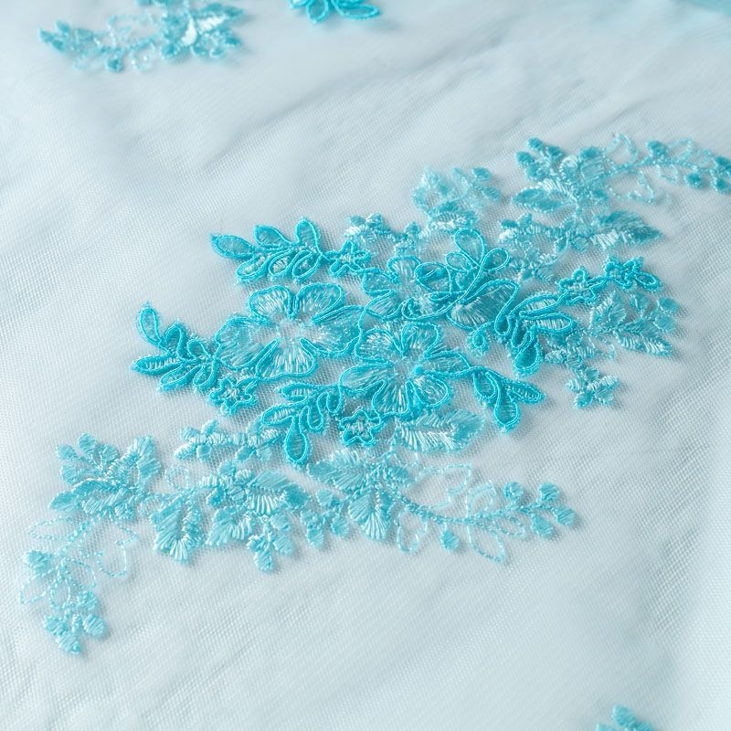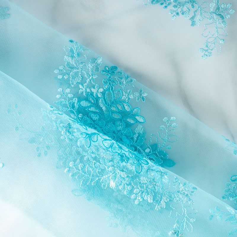 Вышивка на сетке лазурно-голубого цвета с флористическим узором. Полотно мягкое, легкое и пластичное, хорошо тянется. Сетка не жесткая, приятная к телу. Узор вышит мягкой пряжей, образуя красивую фактуру, имитирующую ручную вышивку, и оформлен кордовой нитью. С обеих сторон ткань украшена симметричными фестонами, что придает полотну законченный и нарядный вид. Великолепно будет смотреться в нарядном вечернем платье, платье на выпускной бал, в юбках, блузках, топах. Набирается для изделя объемом.
