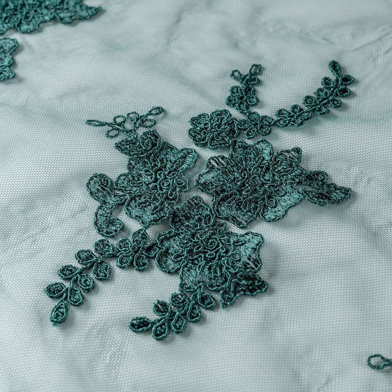 Вышивка на сетке темного оттенка зеленого бутылочного стекла с флористическим узором. Полотно мягкое, легкое и пластичное, хорошо тянется. Сетка не жесткая, приятная к телу. Узор вышит мягкой пряжей, образуя красивую фактуру, имитирующую ручную вышивку, и оформлен кордовой нитью. С обеих сторон ткань украшена симметричными фестонами, что придает полотну законченный и нарядный вид. Великолепно будет смотреться в нарядном вечернем, свадебном платье, платье на выпускной бал, в юбках, блузках, топах. Набирается для изделя объемом.