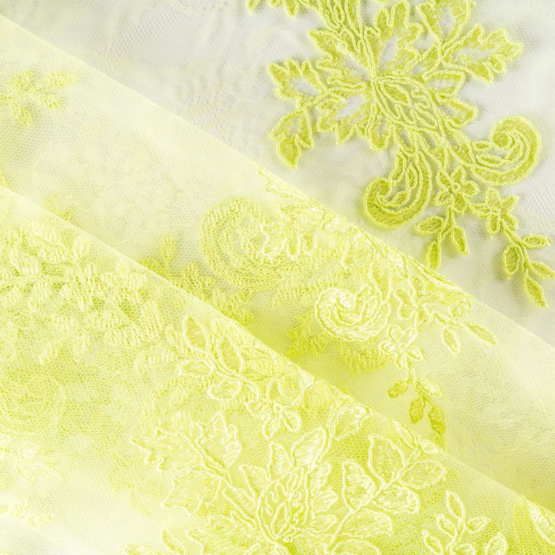 Кружевное полотно на сетчатой жаккардовой основе яркого лаймового неонового оттенка с флористическим узором. Тонкое, легкое, очень мягкое и пластичное, хорошо драпируется, приятное тактильно. Вышивка оформлена кордовой нитью. С обеих сторон ткань украшена симметричными фестонами, что придает полотну законченный и нарядный вид. Великолепно будет смотреться в нарядном вечернем, свадебном платье, платье на выпускной бал, в юбках, блузках, топах. Также можно применять отдельные элементы для декора, которые вырезаются из полотна.