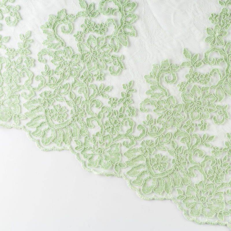 Кружевное полотно на сетчатой жаккардовой основе весеннего светло-зеленого оттенка с флористическим узором. Тонкое, легкое, очень мягкое и пластичное, хорошо драпируется, приятное тактильно. Вышивка оформлена кордовой нитью. С обеих сторон ткань украшена симметричными фестонами, что придает полотну законченный и нарядный вид. Великолепно будет смотреться в нарядном вечернем, свадебном платье, платье на выпускной бал, в юбках, блузках, топах. Также можно применять отдельные элементы для декора, которые вырезаются из полотна.