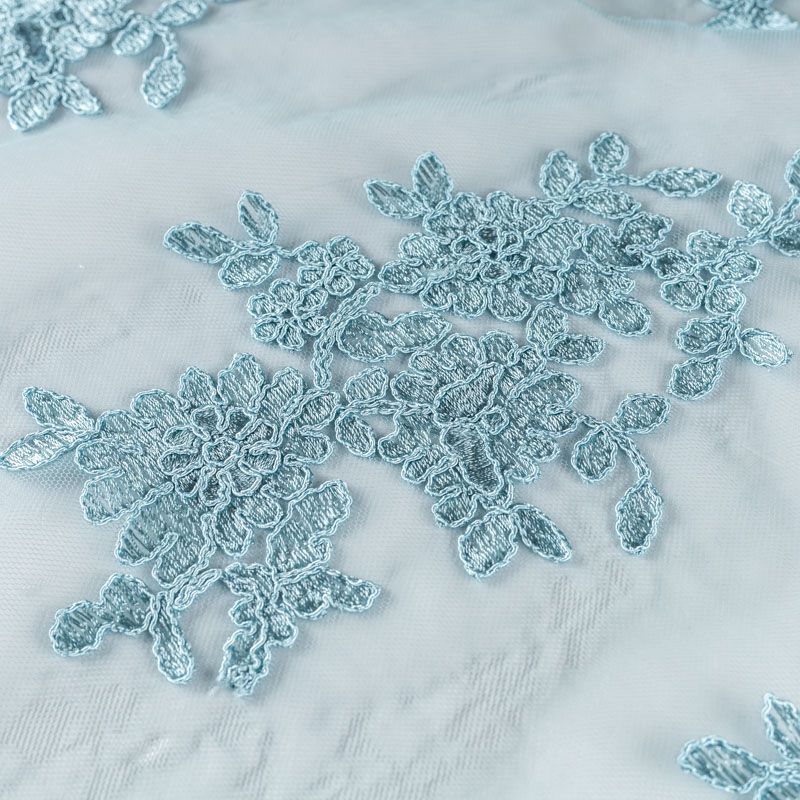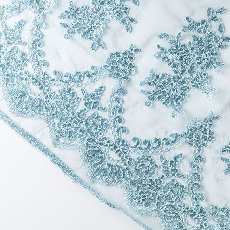 Вышивка на сетке серо-голубого оттенка с флористическим узором. Полотно мягкое, легкое и пластичное, хорошо тянется. Сетка не жесткая, приятная к телу. Узор вышит мягкой пряжей, образуя красивую фактуру, имитирующую ручную вышивку, и оформлен кордовой нитью. С обеих сторон ткань украшена симметричными фестонами, что придает полотну законченный и нарядный вид. Великолепно будет смотреться в нарядном вечернем платье, платье на выпускной бал, в блузках, топах. Набирается для изделя объемом.