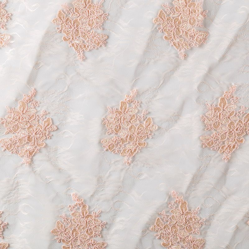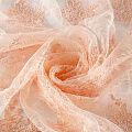 Кружевное полотно на сетчатой жаккардовой основе нежного персикового оттенка с флористическим узором. Тонкое, легкое, очень мягкое и пластичное, хорошо драпируется, приятное тактильно. Вышивка оформлена кордовой нитью. С обеих сторон ткань украшена симметричными фестонами, что придает полотну законченный и нарядный вид. Великолепно будет смотреться в нарядном вечернем, свадебном платье, платье на выпускной бал, в юбках, блузках, топах. Также можно применять отдельные элементы для декора, которые вырезаются из полотна.