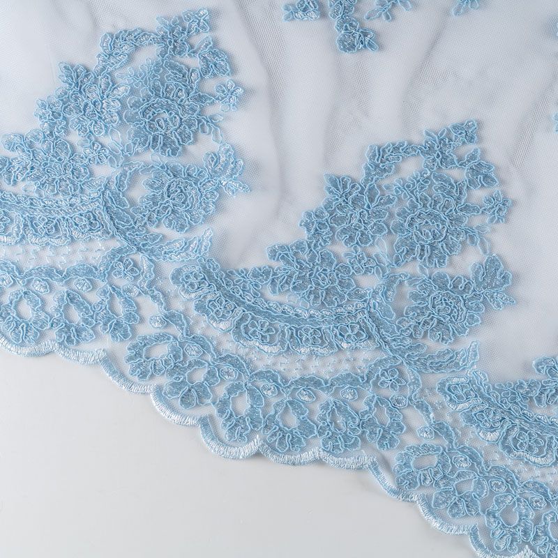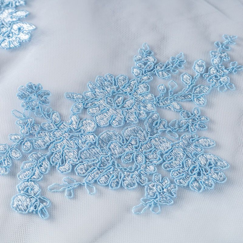 Вышивка на сетке нежного голубого оттенка с флористическим узором. Полотно мягкое, легкое и пластичное, хорошо тянется. Сетка не жесткая, приятная к телу. Узор вышит пряжей, образуя красивую фактуру, имитирующую ручную вышивку, и оформлен кордовой нитью. С обеих сторон ткань украшена симметричными фестонами, что придает полотну законченный и нарядный вид. Великолепно будет смотреться в нарядном вечернем платье, платье на выпускной бал, в блузках, топах. Набирается для изделя объемом.