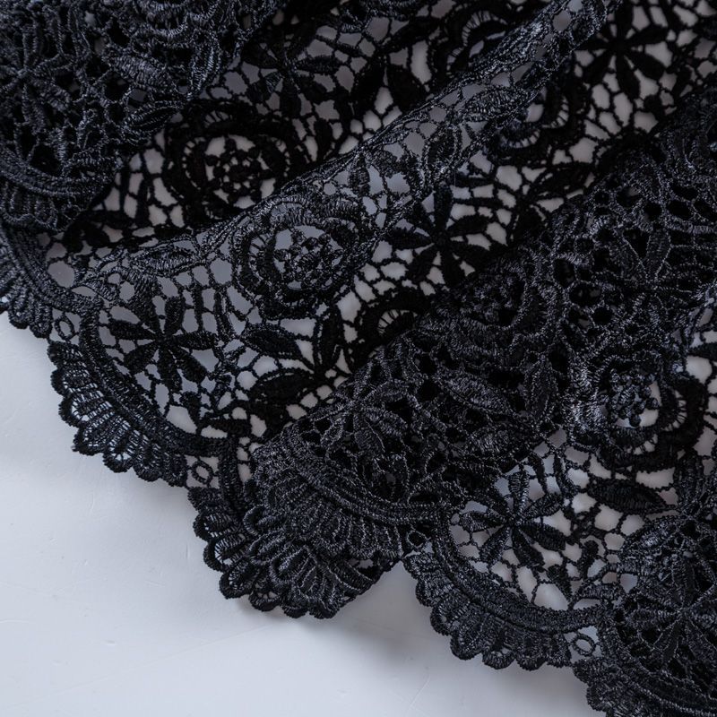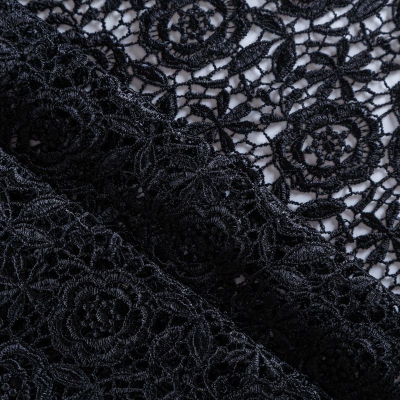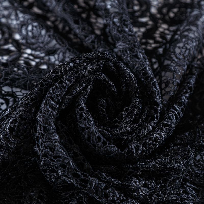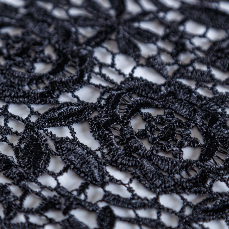Гипюр-макраме представляет собой ажурное полотно, имеющее рельефную текстуру с цветочным ажурным плетением по всей ширине и фестонами по обе стороны кромок. Материал прозрачный на теле и на просвет, требуется подклад. Всегда актуален при создании утончённых и роскошных нарядов, придавая им дороговизны и оригинальности. Может использоваться для пошива платьев, костюмов прямого кроя, изготовления декоративных элеметов. Набирается на изделие объемом.