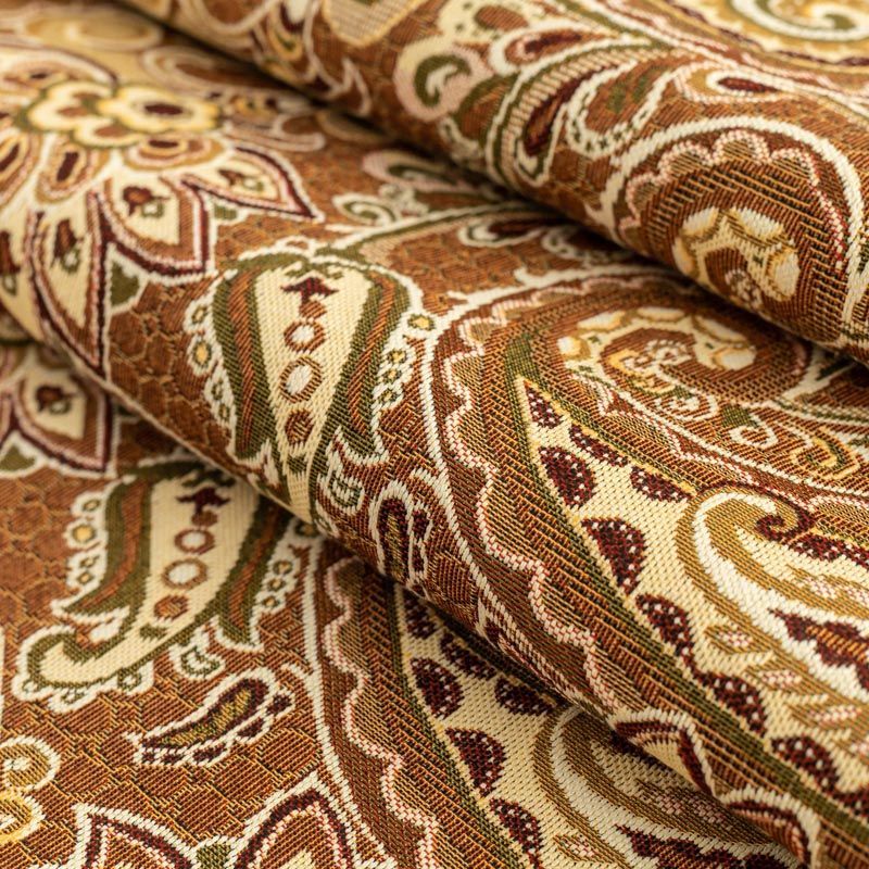 Гобелен представляет собой ткань, выполненную  перекрестным плетением нитей с одномоментным созданием сюжетной или орнаментальной композиции. Это плотный материал высокую прочность и износостойкость. Гобелен используют для пошива плотных светонепроницаемых штор, декоративного домашнего текстиля и аксессуаров, в мебельном производстве для обивки мебели. Так же применяется в рукоделии: модные кошельки, сумочки, пояса и другие аксессуары и при изготовлении дизайнерской одежды. На коричнево-песочном фоне растительный цветной узор в стиле пейсли.