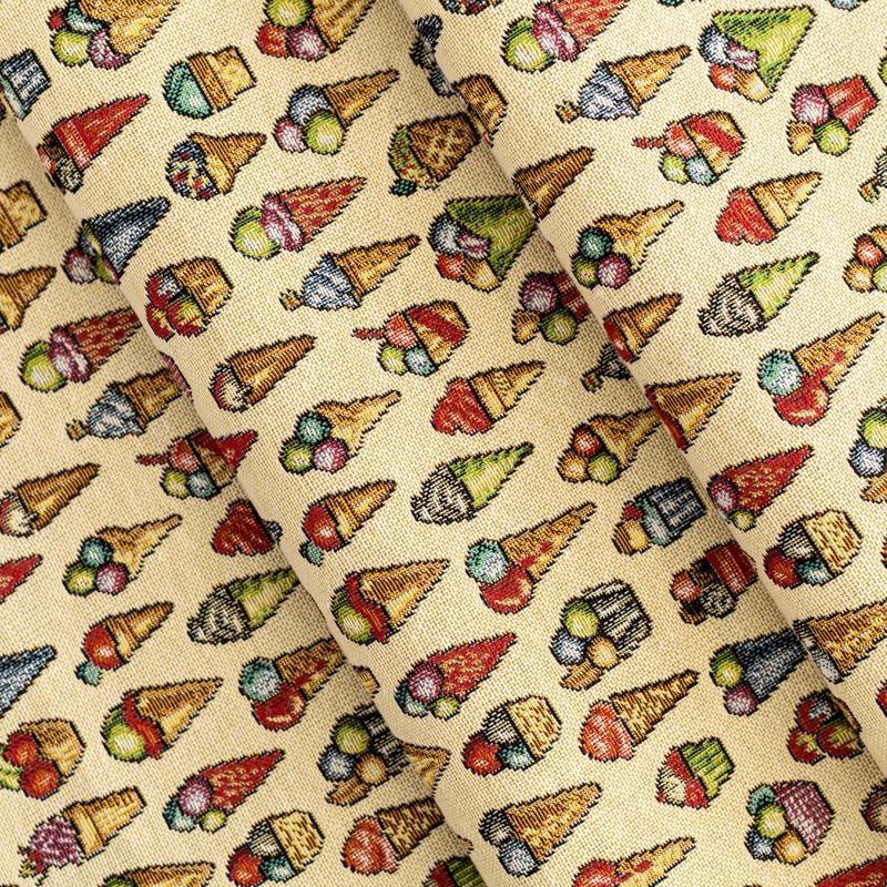Гобелен представляет собой ткань, выполненную  перекрестным плетением нитей с одномоментным созданием сюжетной или орнаментальной композиции. Это плотный материал высокую прочность и износостойкость. Гобелен используют для пошива плотных светонепроницаемых штор, декоративного домашнего текстиля и аксессуаров, в мебельном производстве для обивки мебели. Так же применяется в рукоделии: модные кошельки, сумочки, пояса и другие аксессуары и при изготовлении дизайнерской одежды. На спокойном песочно-бежевом фоне цветное разнообразие рожков и корзиночек с мороженым.
