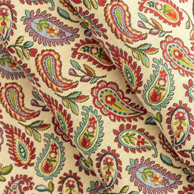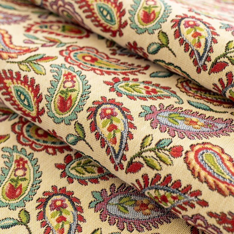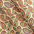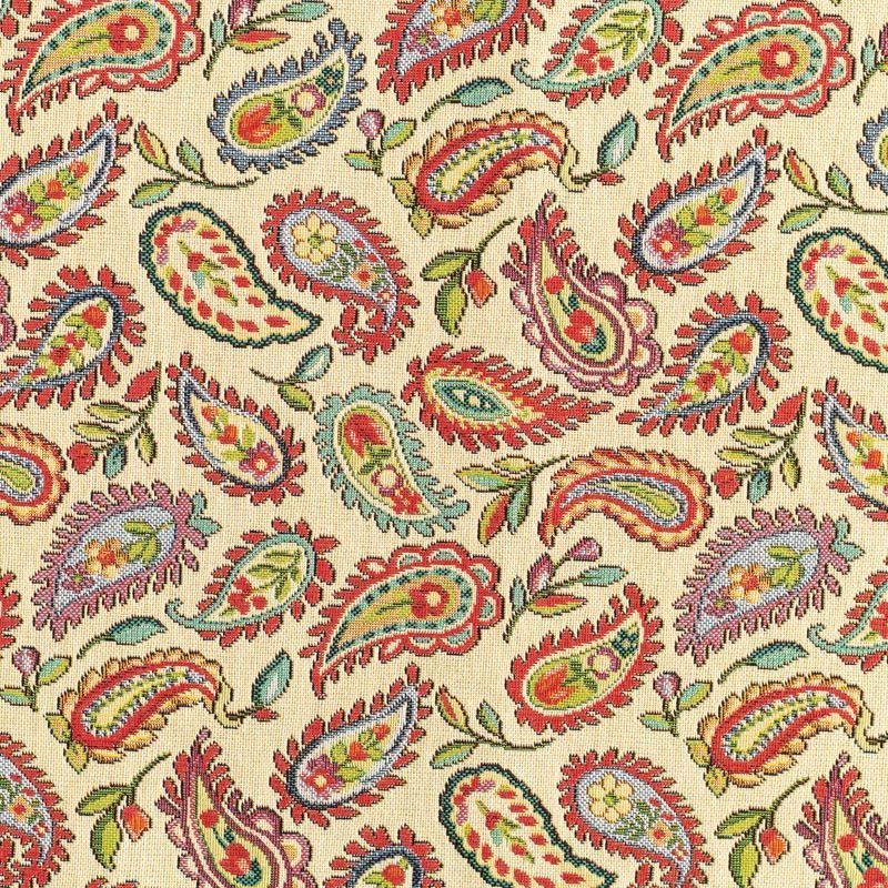 Гобелен представляет собой ткань, выполненную  перекрестным плетением нитей с одномоментным созданием сюжетной или орнаментальной композиции. Это плотный материал высокую прочность и износостойкость. Гобелен используют для пошива плотных светонепроницаемых штор, декоративного домашнего текстиля и аксессуаров, в мебельном производстве для обивки мебели. Так же применяется в рукоделии: модные кошельки, сумочки, пояса и другие аксессуары и при изготовлении дизайнерской одежды. На спокойном песочно-бежевом фоне растительный цветной узор в стиле пейсли.
