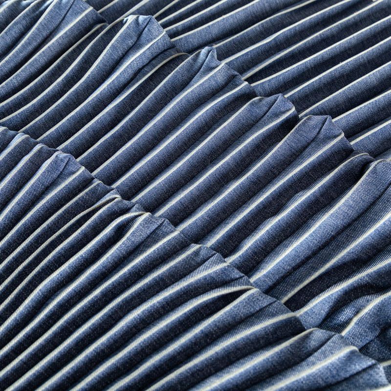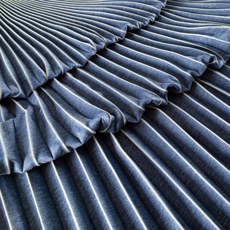 Готовый гофрированный купон из матовой твиловой ткани, имитирующей джинс. Объем по низу 160 см, по талии 60 см, длина 110 см. Ткань раскроена полусолнцем, гофре заложено сверху вниз на увеличение. Ребро складки выделено выбеленным голубым цветом. Гофре визуально вытягивает и стройнит фигуру, именно поэтому уже который год юбки и платья гофре находятся в числе топовых вещей женского гардероба в классическом исполнении – миди и в пол, или в оригинальном ассиметричном крое. Можно использовать для клиновидной вставки в другую юбку, в спинку или рукав.