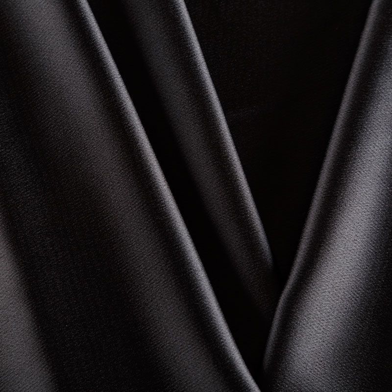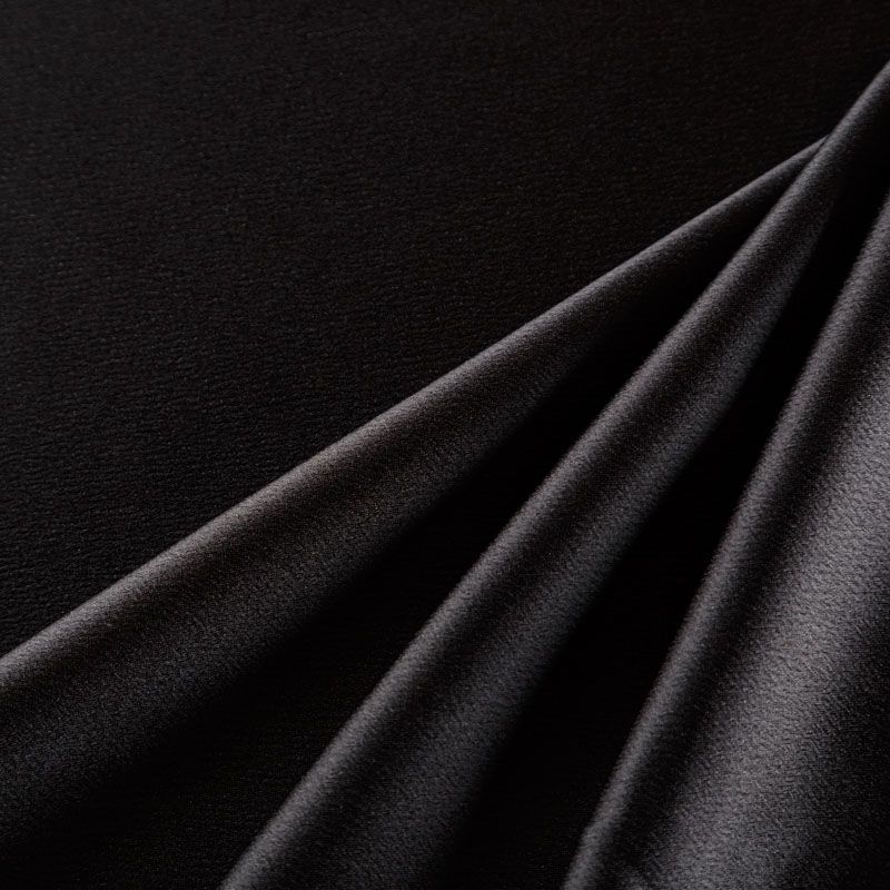 Итальянская ткань кади черного оттенка. Кади — это креп-атлас с красивым глянцевым блеском. Ткань с плотной фактурой, роскошно ниспадает, очень хорошо тянется, изумительно садится по фигуре и шикарно смотрится в изделии. Она хорошо драпируется, эффектно облегает. Подходит для пошива удлиненных платьев с драпировками, платья-футляра, брюк палаццо, юбки-карандаш, жакета, туники, кроп-топа, а также для вечерних, свадебных и  выпускных платьев и костюмов.