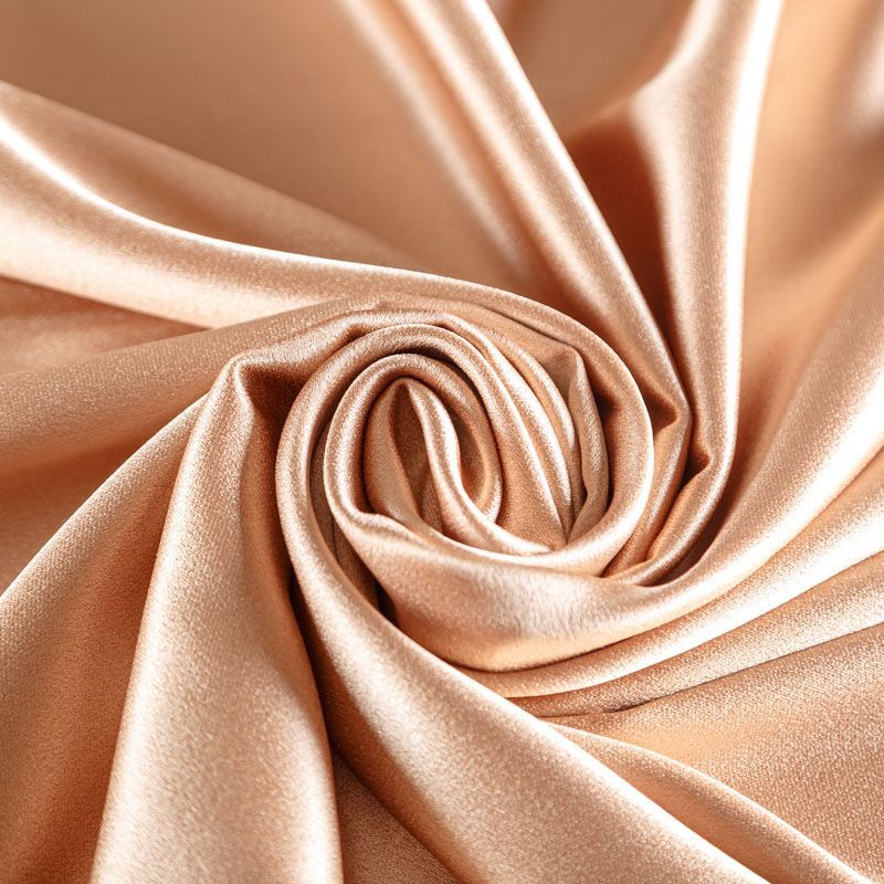 Итальянская ткань кади светло-коричневого оттенка. Кади — это креп-атлас с красивым глянцевым блеском. Ткань с плотной фактурой, роскошно ниспадает, очень хорошо тянется, изумительно садится по фигуре и шикарно смотрится в изделии. Она хорошо драпируется, эффектно облегает. Подходит для пошива удлиненных платьев с драпировками, платья-футляра, брюк палаццо, юбки-карандаш, жакета, туники, кроп-топа, а также для вечерних, свадебных и  выпускных платьев и костюмов.