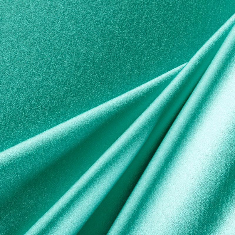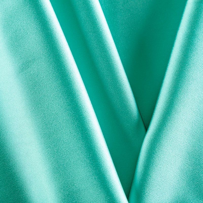 Итальянская ткань кади зеленого оттенка. Кади — это креп-атлас с красивым глянцевым блеском. Ткань с плотной фактурой, роскошно ниспадает, очень хорошо тянется, изумительно садится по фигуре и шикарно смотрится в изделии. Она хорошо драпируется, эффектно облегает. Подходит для пошива удлиненных платьев с драпировками, платья-футляра, брюк палаццо, юбки-карандаш, жакета, туники, кроп-топа, а также для вечерних, свадебных и  выпускных платьев и костюмов.