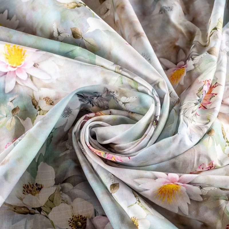 Плательно-блузочная ткань из натурального хлопка с крупным расттительным принтом в пастельных тонах на серо-зеленом фоне. Ткань легкая, тонкая, хорошо "дышит", мягкая, слегка прозрачная, по плотности напоминает батист. Подойдет для пошива летнего платья, летящей юбки, блузы, сарафана или рубашки.