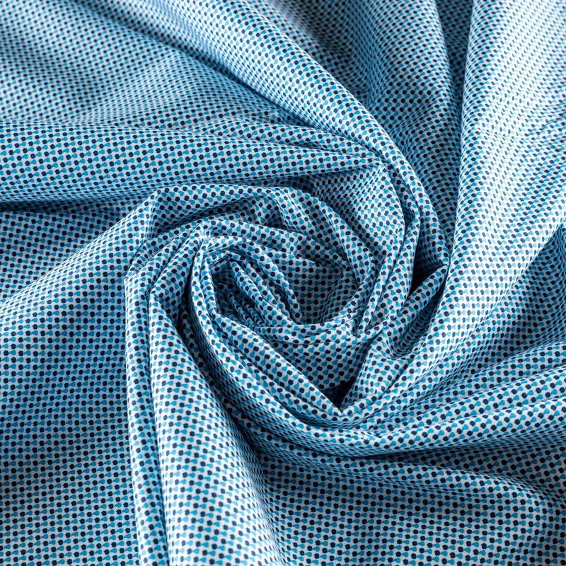 На белом фоне мелкий геометрический рисунок синего и лазурного цвета.