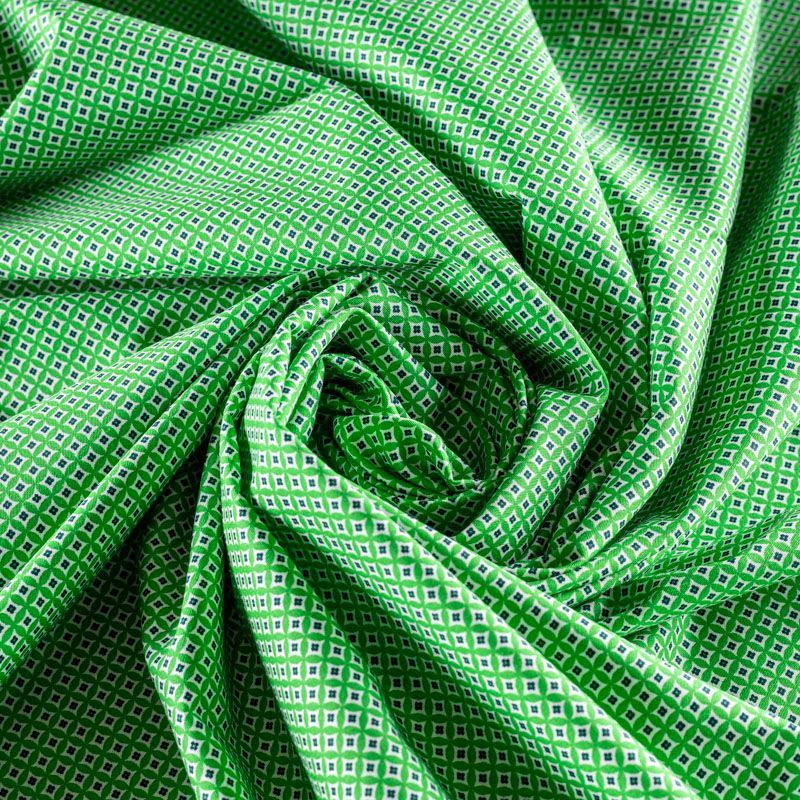 Ткань мягкая, тонкая, лёгкая, непрозрачная, поверхность матовая, приятная к телу, хорошо драпируется. По назначению - рубашечная, для юбки, платья, сарафана, туники. На насыщенном зеленом фоне мелкий геометрический рисунок белого и темно-синего цвета.
