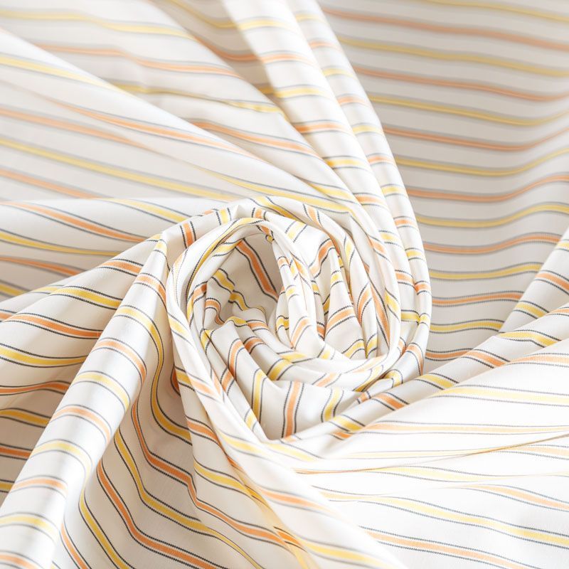 Плательно-рубашечный хлопок в белого цвета освежает не широкая цветная полоска. Ткань мягкая, лёгкая, непрозрачная, пластичная и приятная к телу, хорошо драпируется, имеет гладкую матовую поверхность и сатиновое плетение. Прекрасно подойдет как для пошива платья-рубашки, сарафана, платьев различных фасонов, туники, топа, летнего костюма, комбинезона, мужкой и детской одежды.