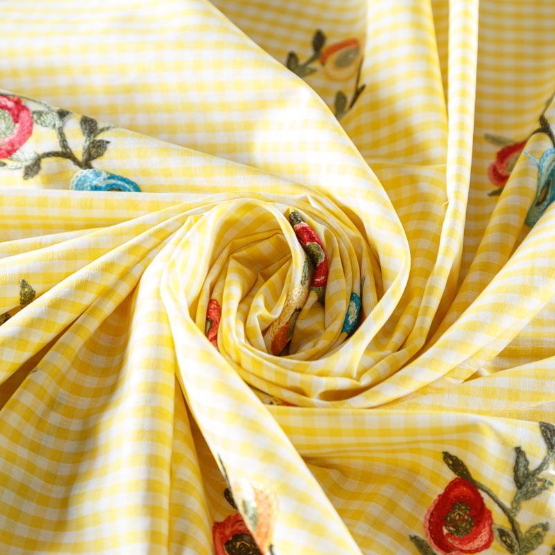 Плательно-блузочный хлопок в мелкую желто-белую клеточку декорирован яркой цветочной вышивкой. Полотно средней плотности, слегка просвечивает, очень нежное и пластичное, держит форму. Материал отлично драпируется, формируя мягкие складки. Подойдет для прямых, полуприлегающих, расклешенных моделей платьев, сарафанов, а также юбки, туники, платье-рубашки.